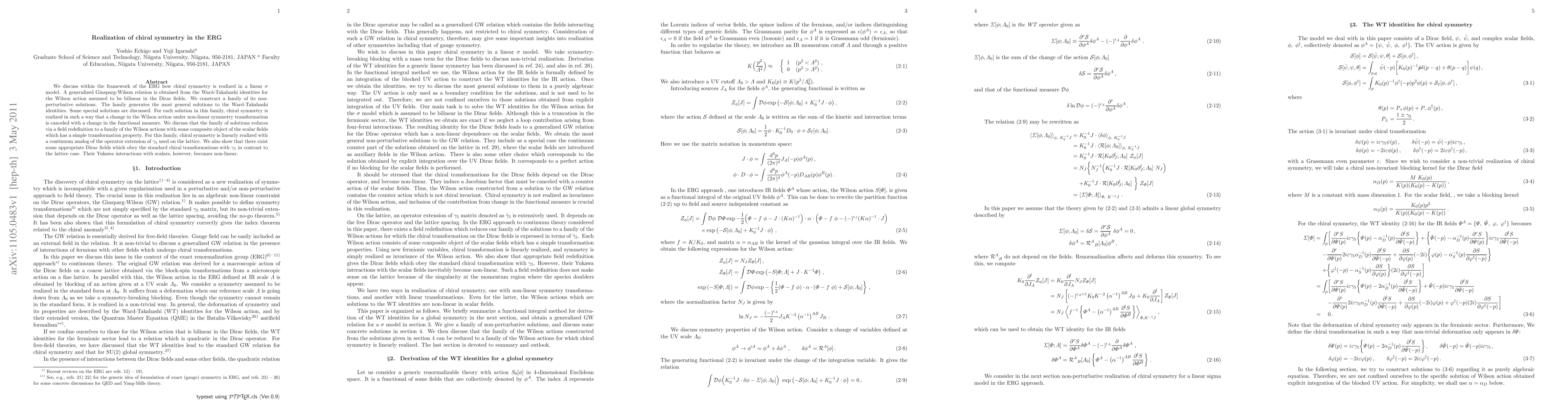 This paper explores the realization of chiral symmetry in the framework of the ERG within a linear $\sigma$ model, deriving a generalized Ginsparg-Wilson relation and constructing non-perturbative solutions that satisfy the Ward-Takahashi identities, ultimately showing linear realization of chiral symmetry via a field redefinition.