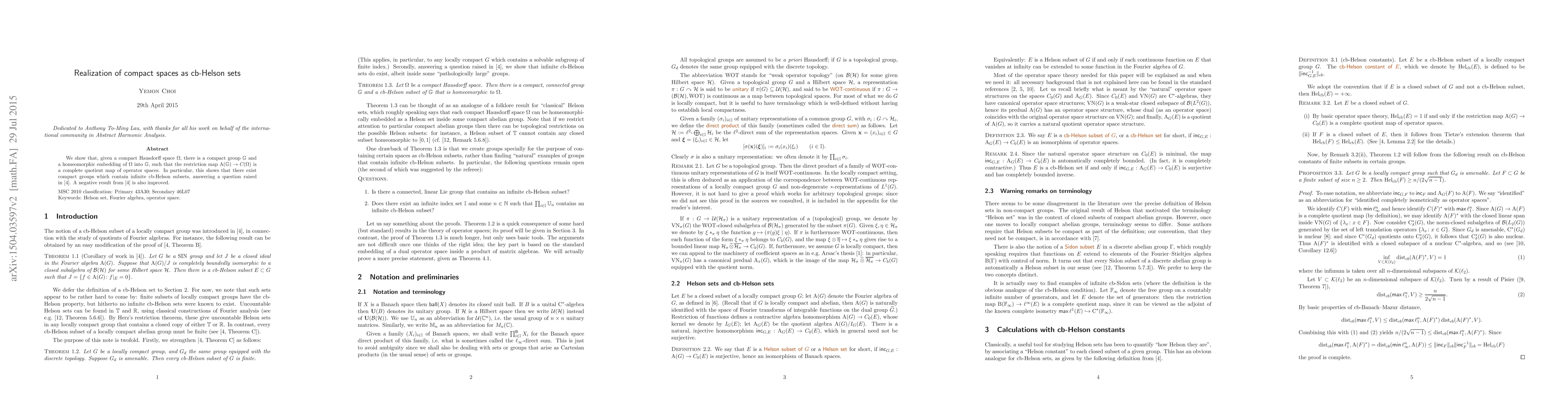 We show that, given a compact Hausdorff space $\Omega$, there is a compact group ${\mathbb G}$ and a homeomorphic embedding of $\Omega$ into ${\mathbb G}$, such that the restriction map ${\rm A}({\mathbb G})\to C(\Omega)$ is a complete quotient map of operator spaces. In particular, this shows that there exist compact groups which contain infinite cb-Helson subsets, answering a question raised in [Choi--Samei, Proc. AMS 2013; cf. http://arxiv.org/abs/1104.2953]. A negative result from the same paper is also improved.