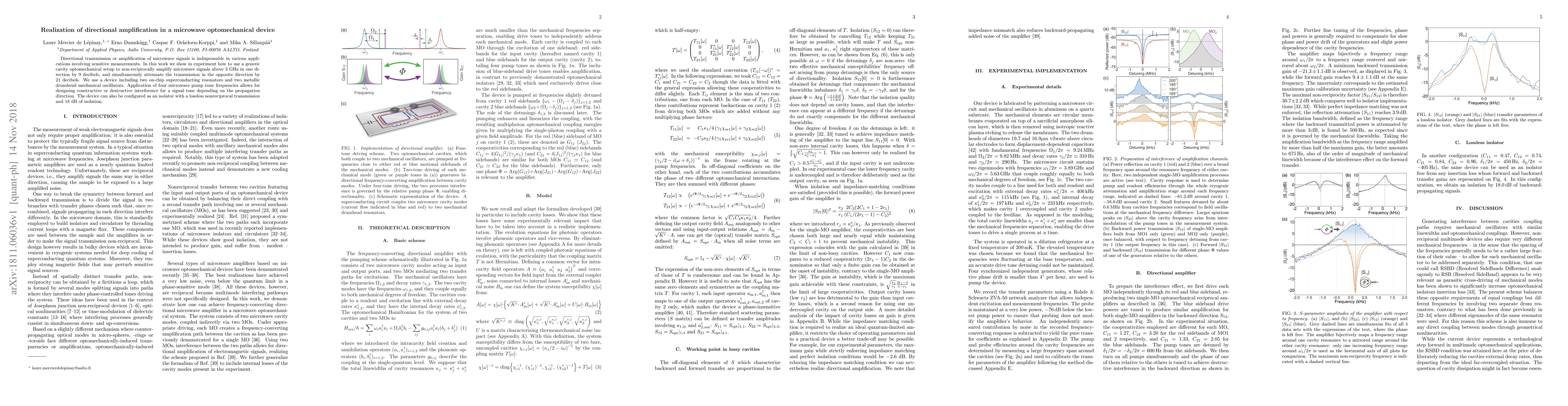 This research demonstrates a cavity optomechanical device that non-reciprocally amplifies microwave signals by 9 dB in one direction while attenuating them by 21 dB in the opposite direction, utilizing two superconducting resonators and two mechanical oscillators. The device employs four microwave pump tones to achieve directional signal control and can function as an isolator with 18 dB of isolation.