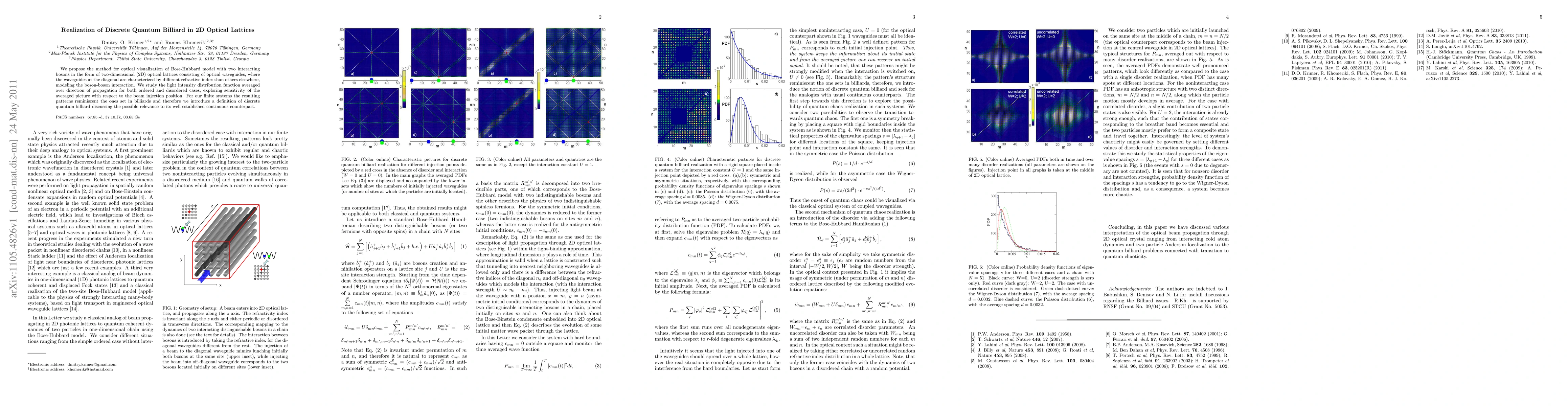 We propose the method for optical visualization of Bose-Hubbard model with two interacting bosons in the form of two-dimensional (2D) optical lattices consisting of optical waveguides, where the waveguides at the diagonal are characterized by different refractive index than others elsewhere, modeling the boson-boson interaction. We study the light intensity distribution function averaged over direction of propagation for both ordered and disordered cases, exploring sensitivity of the averaged picture with respect to the beam injection position. For our finite systems the resulting patterns reminiscent the ones set in billiards and therefore we introduce a definition of discrete quantum billiard discussing the possible relevance to its well established continuous counterpart.