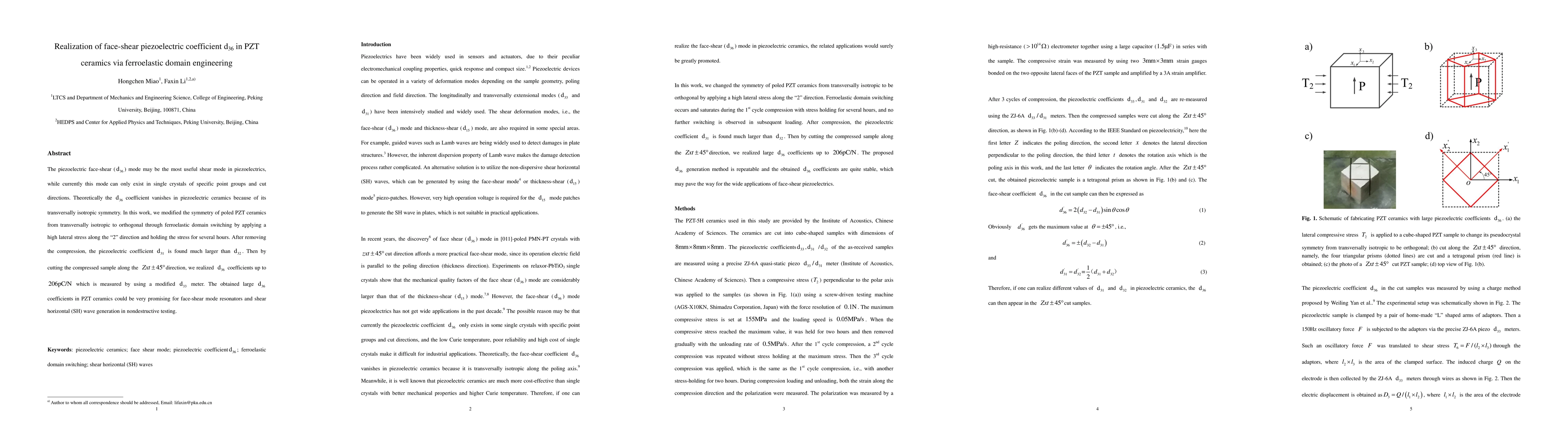 This paper demonstrates the realization of the face-shear piezoelectric coefficient d36 in PZT ceramics through ferroelastic domain engineering, achieving d36 values up to 206 pC/N, which could enhance applications in nondestructive testing.