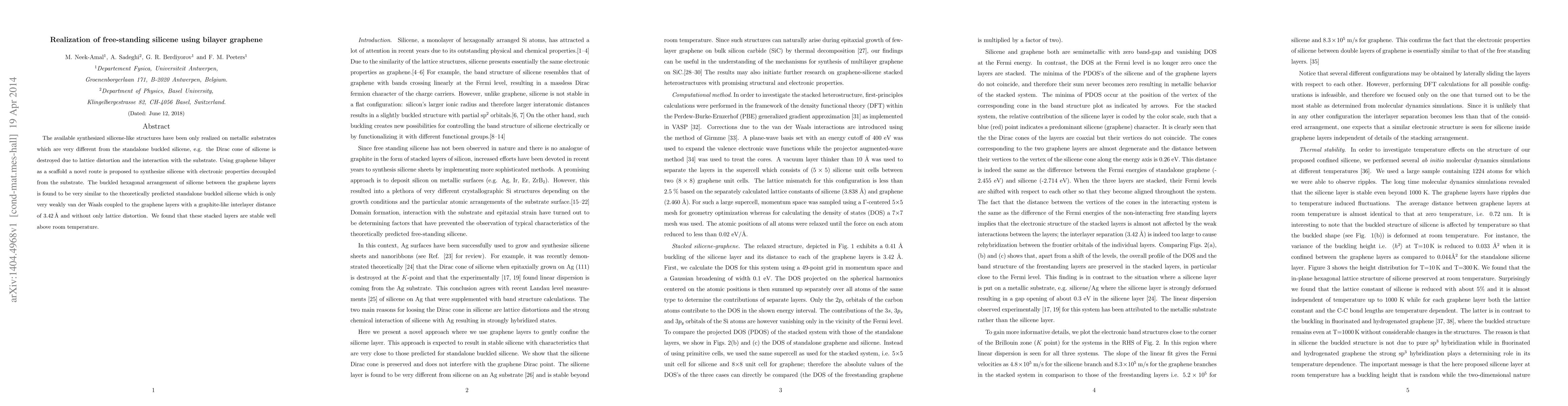 This paper proposes a novel method to synthesize free-standing silicene using bilayer graphene as a scaffold, maintaining its standalone buckled hexagonal structure and electronic properties without substrate interaction-induced lattice distortion. The synthesized silicene retains its theoretical properties and remains stable at room temperature.