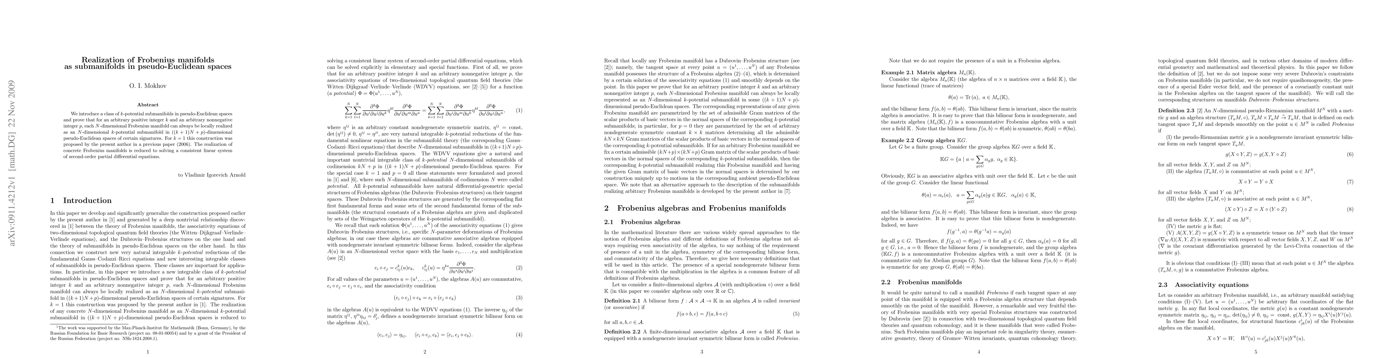 Summary: This paper introduces k-potential submanifolds in pseudo-Euclidean spaces and demonstrates that any N-dimensional Frobenius manifold can be locally realized as an N-dimensional k-potential submanifold in a higher-dimensional pseudo-Euclidean space, with a method for solving a system of second-order partial differential equations to achieve the realization.