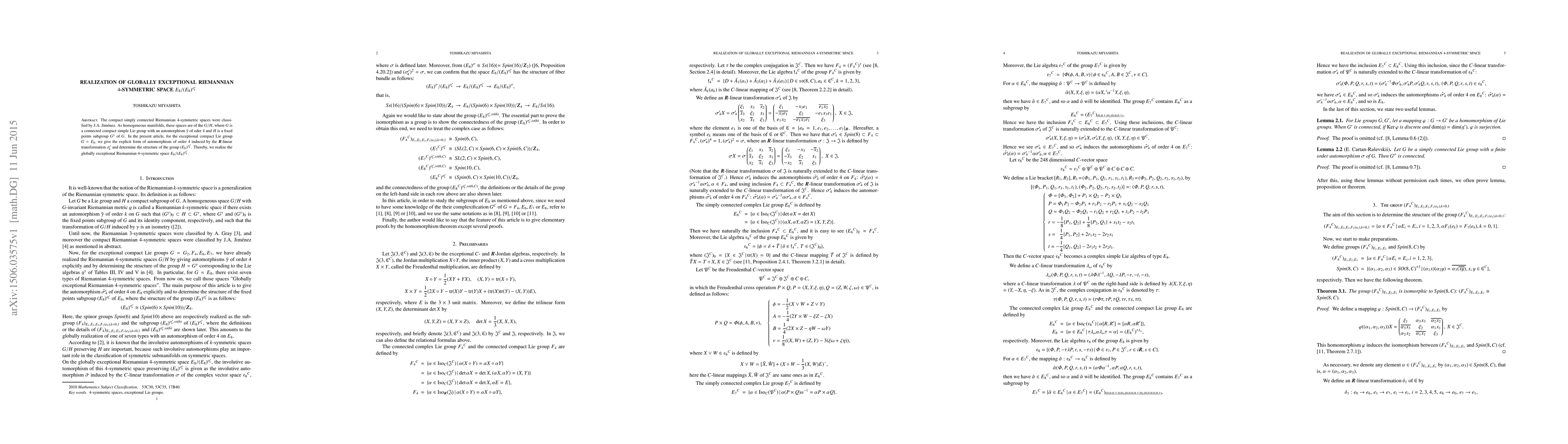 Researchers realize a globally exceptional Riemannian 4-symmetric space $E_8/(E_8)^{oldsymbol{R}}$-linear transformation $oldsymbol{ heta}$ induced by the automorphism of order 4 in the compact Lie group $E_8$, determining its structure and realizing the space.