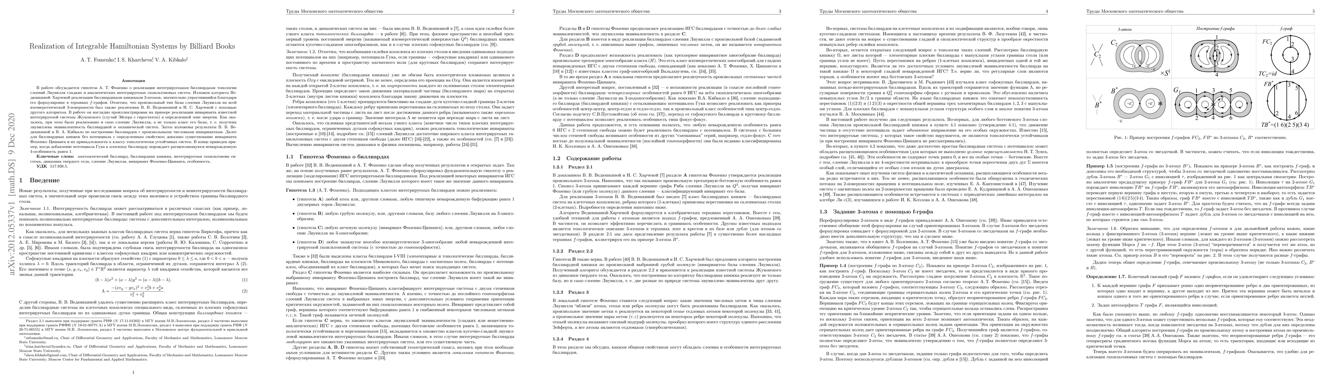 This paper explores the realization of integrable Hamiltonian systems through billiard books, focusing on Fomenko's conjecture and the Vedyushkina-Kharcheva algorithm for 3-atom realization. It demonstrates the algorithm's application to the Zhukovskii integrable system, showing Liouville equivalence between billiard and mechanical systems, and discusses topological stability and singularities in planar billiard systems.