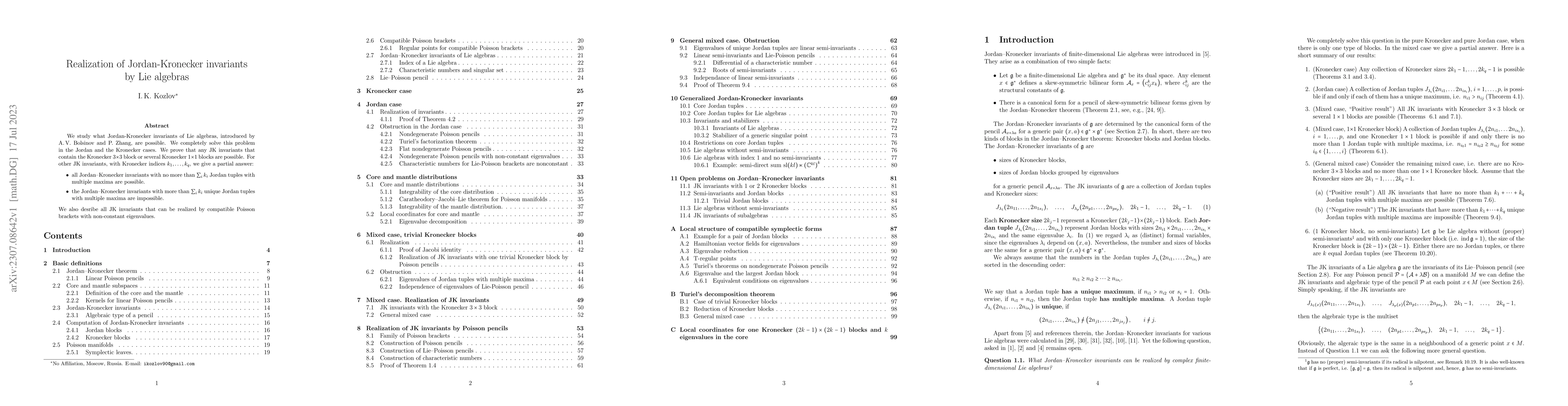 We study what Jordan-Kronecker invariants of Lie algebras, introduced by A. V. Bolsinov and P. Zhang, are possible. We completely solve this problem in the Jordan and the Kronecker cases. We prove that any JK invariants that contain the Kronecker $3 \times 3$ block or several Kronecker $1 \times 1$ blocks are possible. For other JK invariants, with Kronecker indices $k_1, \dots, k_q$, we give a partial answer: all Jordan--Kronecker invariants with no more than $\sum_i k_i$ Jordan tuples with multiple maxima are possible; the Jordan--Kronecker invariants with more than $\sum_i k_i$ unique Jordan tuples with multiple maxima are impossible. We also desribe all JK invariants that can be realized by compatible Poisson brackets with non-constant eigenvalues