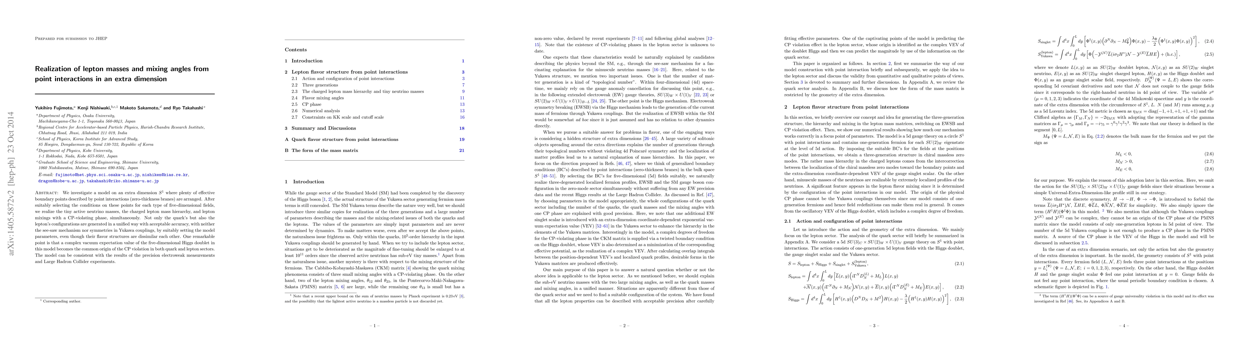 This paper proposes a model on an extra dimension $S^1$ with point interactions to generate lepton masses and mixing angles, achieving tiny active neutrino masses, charged lepton hierarchy, and CP-violating mixing without relying on the see-saw mechanism or Yukawa symmetries. The model also unifies quark and lepton configurations and is consistent with precision electroweak and collider experiments.
