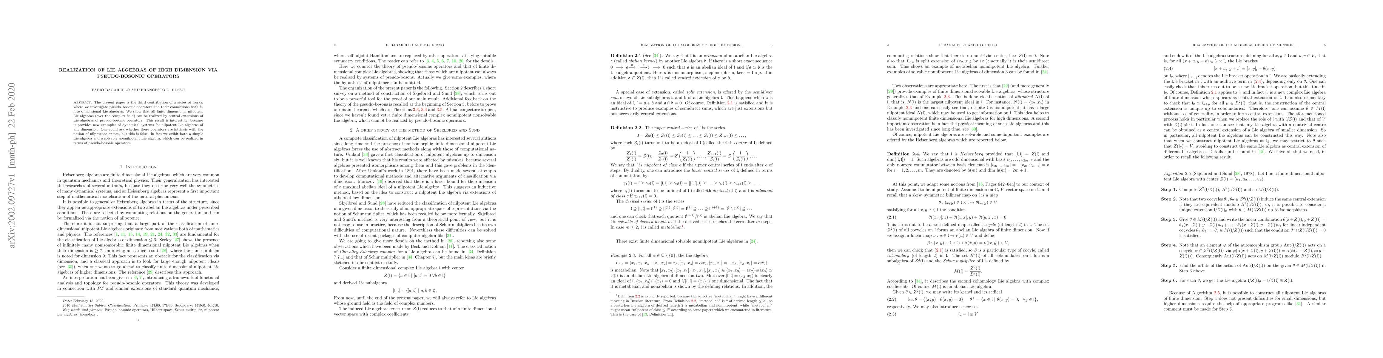 The present paper is the third contribution of a series of works, where we investigate pseudo--bosonic operators and their connections with finite dimensional Lie algebras. We show that all finite dimensional nilpotent Lie algebras (over the complex field) can be realized by central extensions of Lie algebras of pseudo-bosonic operators. This result is interesting, because it provides new examples of dynamical systems for nilpotent Lie algebras of any dimension. One could ask whether these operators are intrinsic with the notion of nilpotence or not, but this is false. In fact we exibit both a simple Lie algebra and a solvable nonnilpotent Lie algebra, which can be realized in terms of pseudo-bosonic operators.