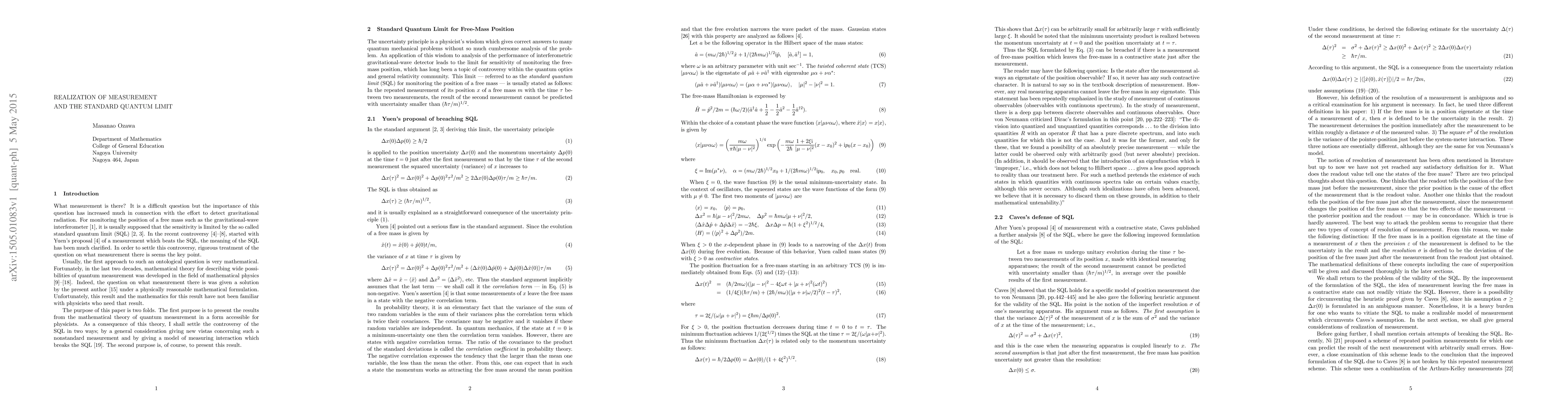 This paper, following [M. Ozawa, Phys. Rev. Lett. 60, 385 (1988)], reports a refutation of the claim that for monitoring the position of a free mass such as gravitational-wave interferometers the sensitivity is limited by the so called standard quantum limit (SQL) due to the uncertainty principle. The latest proof of the SQL is analyzed to revleal an unsupported assumption on quantum measurements. Quantum measurement theory is introduced to give a general criterion for physically realizable measurements in quantum mechanics. A theory of approximate position measurements is developed to obtain a rigorous condition for the SQL and also to show that a precise position measurement can leave the object in an arbitrary family of states independent of the input state. This concludes that Yuen's proposal of breaking the SQL by a contractive state measurement, a measurement of the position leaving the free mass in a state with the position uncertainty decreasing in time, is physically realizable in principle. To enforce this conclusion, a model for error-free position measurement that leaves the object in a contractive state is constructed with a solvable Hamiltonian for measuring interaction. Finally, this model is shown to break the SQL with arbitrary accuracy.