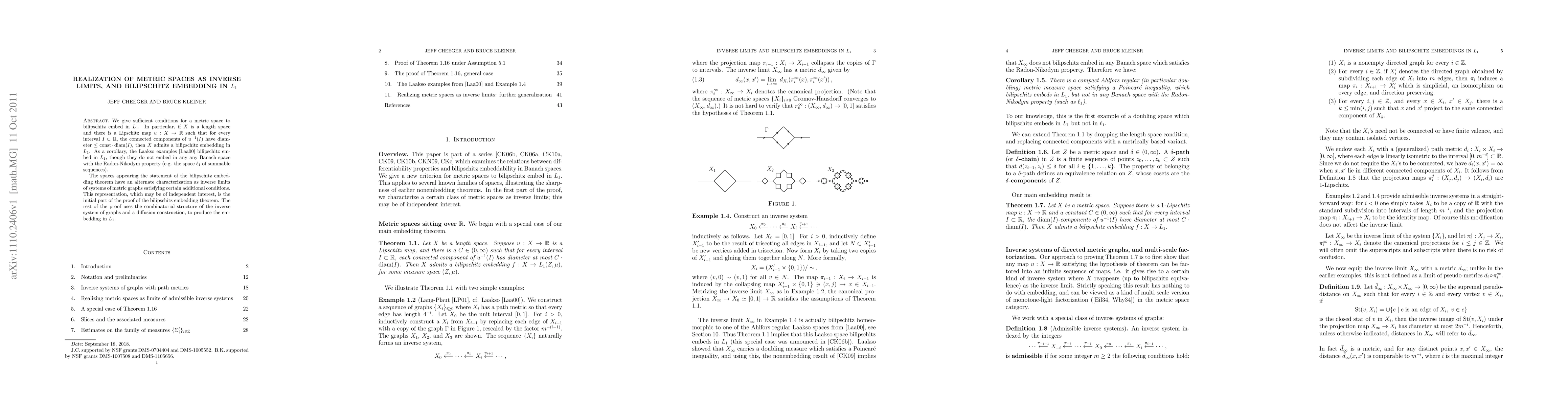 We give sufficient conditions for a metric space to bilipschitz embed in L_1. In particular, if X is a length space and there is a Lipschitz map u:X--->R such that for every interval I in R, the connected components of the inverse image f^{-1}(I) have diameter at most a constant time the diameter of I, then X admits a bilipschitz embedding in L_1. As a corollary, well-known examples of Laakso bilipschitz embed in L_1, though they do not embed in any any Banach space with the Radon-Nikodym property (e.g. the space l_1 of summable sequences). The spaces appearing the statement of the bilipschitz embedding theorem have an alternate characterization as inverse limits of systems of metric graphs satisfying certain additional conditions. This representation, which may be of independent interest, is the initial part of the proof of the bilipschitz embedding theorem. The rest of the proof uses the combinatorial structure of the inverse system of graphs and a diffusion construction, to produce the embedding in L_1.