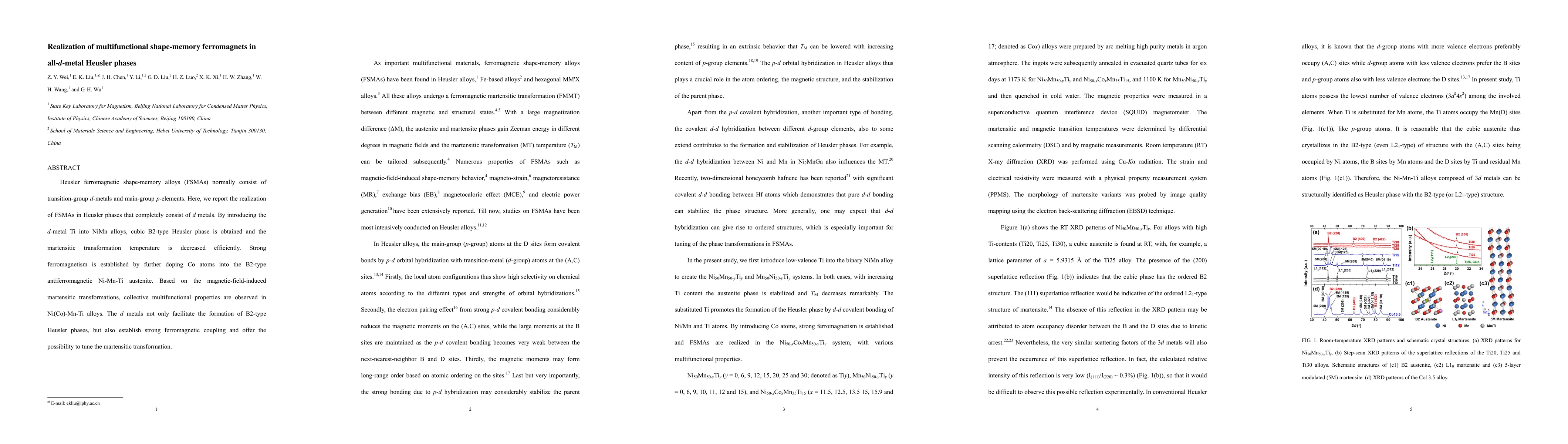 This paper reports the development of multifunctional shape-memory ferromagnets in all-d-metal Heusler phases by doping Ti into NiMn alloys and further doping Co to achieve strong ferromagnetism. The resulting Ni(Co)-Mn-Ti alloys exhibit collective multifunctional properties through magnetic-field-induced martensitic transformations.