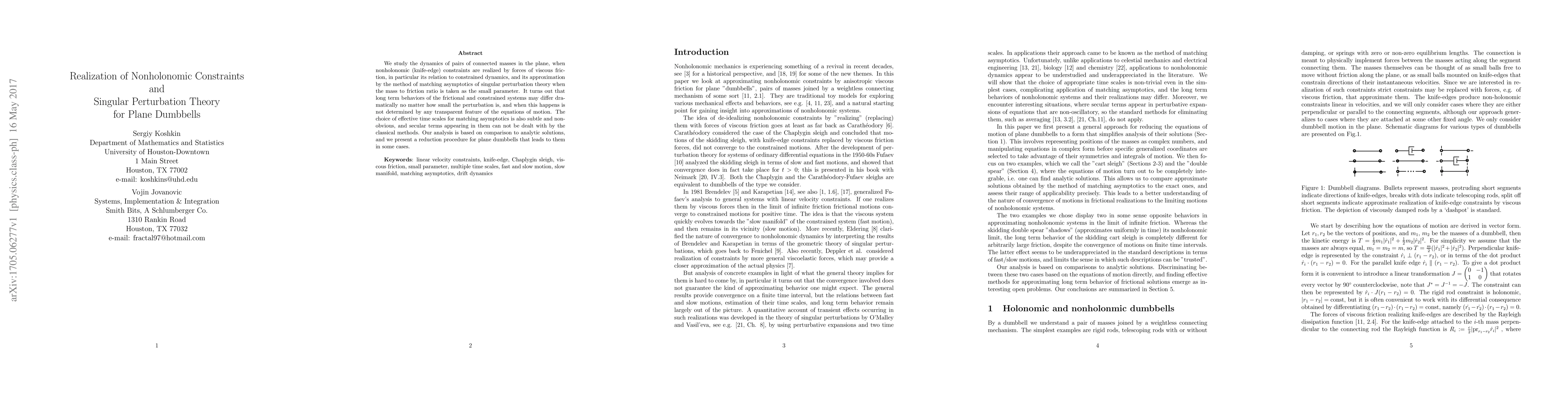 We study the dynamics of pairs of connected masses in the plane, when nonholonomic (knife-edge) constraints are realized by forces of viscous friction, in particular its relation to constrained dynamics, and its approximation by the method of matching asymptotics of singular perturbation theory when the mass to friction ratio is taken as the small parameter. It turns out that long term behaviors of the frictional and constrained systems may differ dramatically no matter how small the perturbation is, and when this happens is not determined by any transparent feature of the equations of motion. The choice of effective time scales for matching asymptotics is also subtle and non-obvious, and secular terms appearing in them can not be dealt with by the classical methods. Our analysis is based on comparison to analytic solutions, and we present a reduction procedure for plane dumbbells that leads to them in some cases.