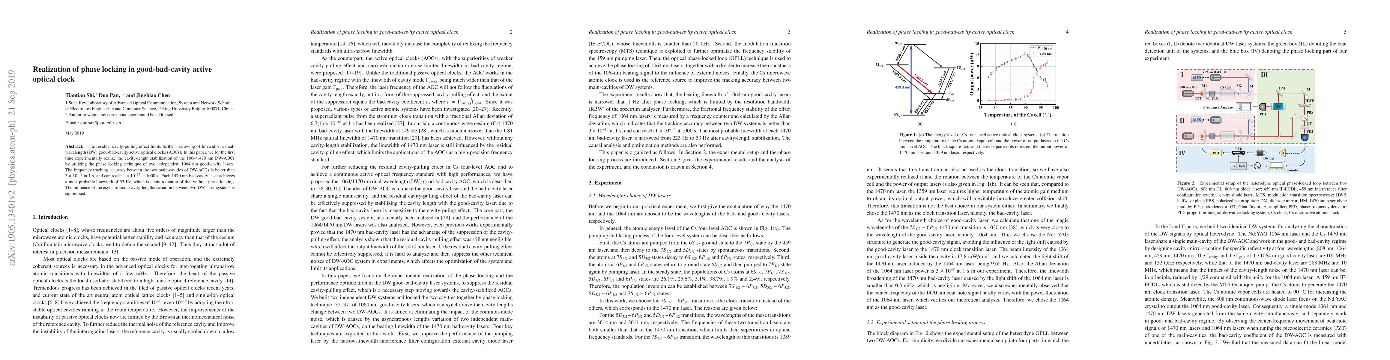 The residual cavity-pulling effect limits further narrowing of linewidth in dual-wavelength (DW) good-bad-cavity active optical clocks (AOCs). In this paper, we for the first time experimentally realize the cavity-length stabilization of the 1064/1470 nm DW-AOCs by utilizing the phase locking technique of two independent 1064 nm good-cavity lasers. The frequency tracking accuracy between the two main-cavities of DW-AOCs is better than $3 \times {10^{ - 16}}$ at 1 s, and can reach $1 \times {10^{ - 17}}$ at 1000 s. Each 1470 nm bad-cavity laser achieves a most probable linewidth of 53 Hz, which is about a quarter of that without phase locking. The influence of the asynchronous cavity-lengths variation between two DW laser systems is suppressed.