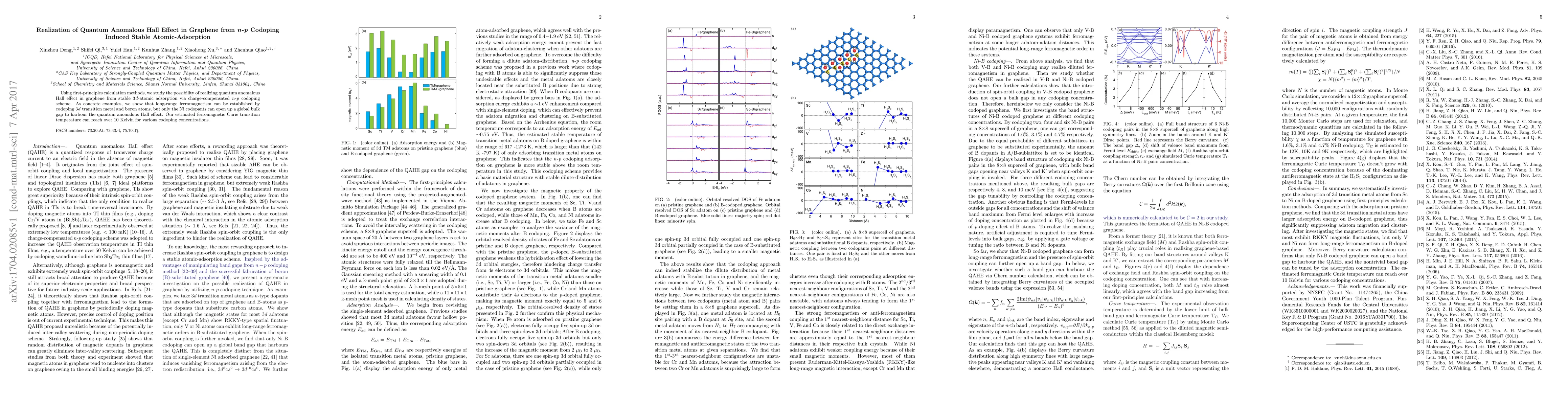 This paper explores the quantum anomalous Hall effect in graphene through stable atomic adsorption via charge-compensated n-p codoping. It demonstrates that Ni codoping with 3d transition metals and boron atoms can create long-range ferromagnetism and open a bulk gap necessary for the quantum anomalous Hall effect, with Curie temperatures exceeding 10 Kelvin.