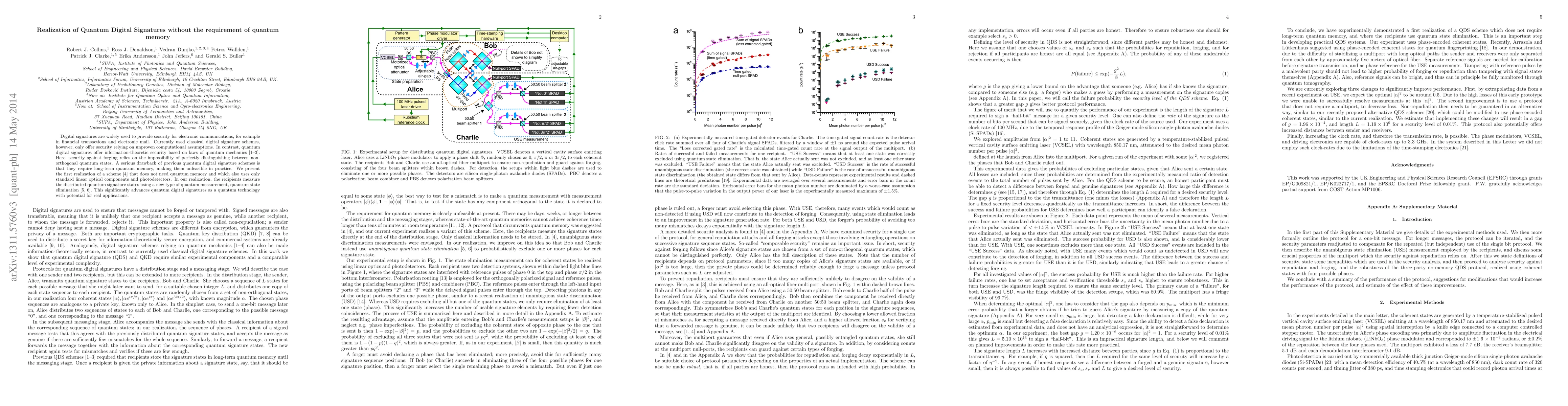 Digital signatures are widely used to provide security for electronic communications, for example in financial transactions and electronic mail. Currently used classical digital signature schemes, however, only offer security relying on unproven computational assumptions. In contrast, quantum digital signatures (QDS) offer information-theoretic security based on laws of quantum mechanics (e.g. Gottesman and Chuang 2001). Here, security against forging relies on the impossibility of perfectly distinguishing between non-orthogonal quantum states. A serious drawback of previous QDS schemes is however that they require long-term quantum memory, making them unfeasible in practice. We present the first realisation of a scheme (Dunjko et al 2013) that does not need quantum memory, and which also uses only standard linear optical components and photodetectors. To achieve this, the recipients measure the distributed quantum signature states using a new type of quantum measurement, quantum state elimination (e.g. Barnett 2009, Bandyopadhyay et al 2013). This significantly advances QDS as a quantum technology with potential for real applications.