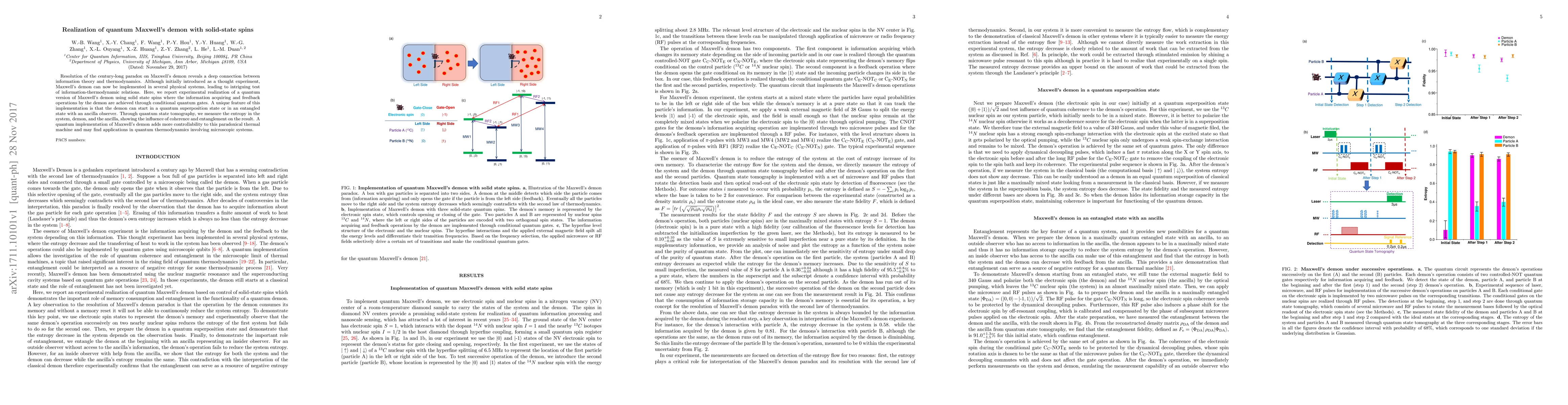 This paper reports the experimental realization of a quantum version of Maxwell's demon using solid-state spins, demonstrating the interplay between information theory and thermodynamics through conditional quantum gates. The study highlights the effects of quantum coherence and entanglement on entropy measurements, suggesting potential applications in quantum thermodynamics.