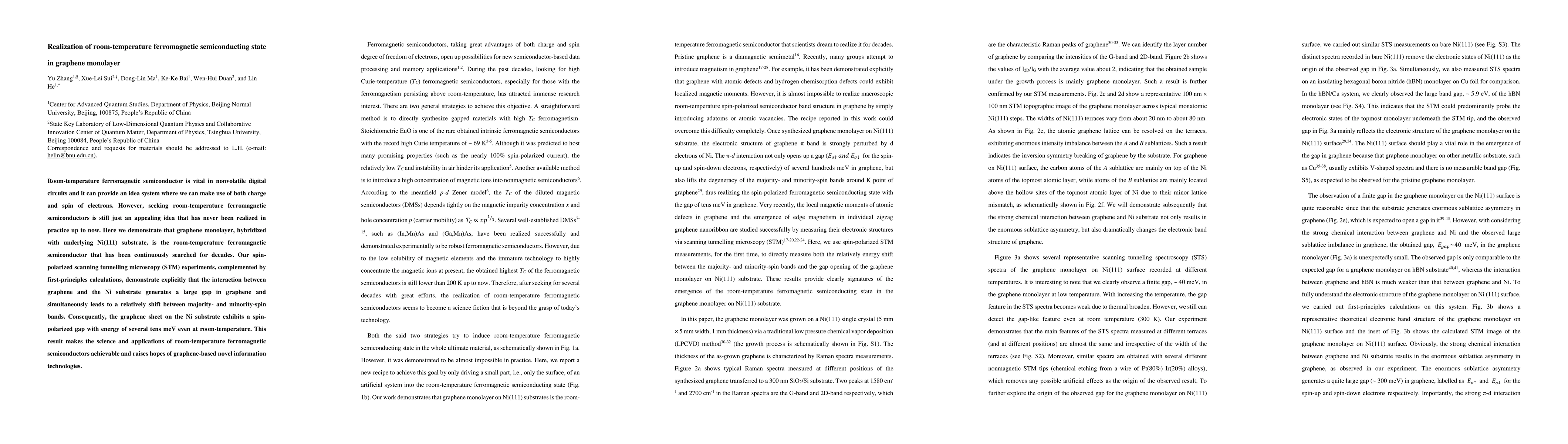 This paper demonstrates the realization of a room-temperature ferromagnetic semiconductor in graphene monolayer hybridized with a Ni(111) substrate, achieved through spin-polarized scanning tunneling microscopy and first-principles calculations. The interaction between graphene and the Ni substrate generates a large gap and spin-polarized state, paving the way for novel graphene-based information technologies.