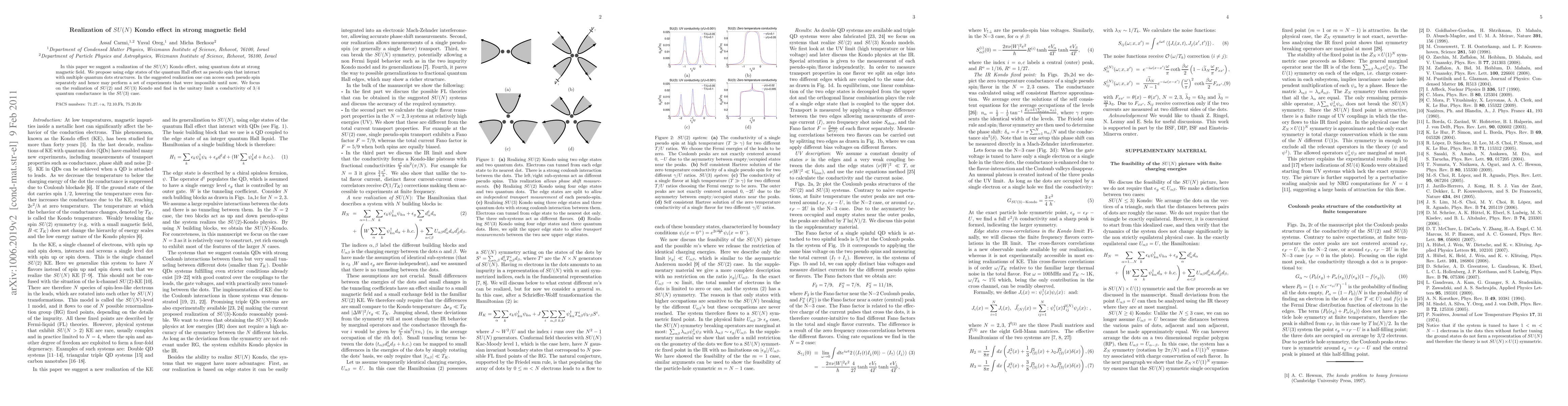 In this paper we suggest a realization for the SU(N) Kondo effect, using quantum dots at strong magnetic field. We purpose using edge states of the quantum Hall effect as pseudo spin that interact with multiple quantum dots structures. In the suggested realization one can access each pseudo spin separately and hence may perform a set of experiments that were impossible until now. We focus on the realization of SU(2) and SU(3) Kondo and find a conductivity of 3/4 quantum conductance in the SU(3) case.