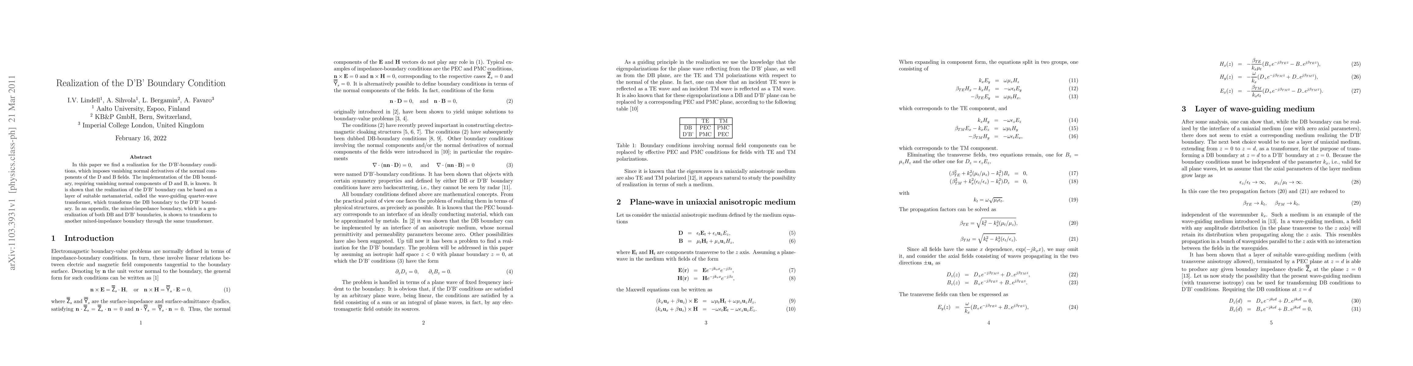 In this paper we find a realization for the D'B'-boundary conditions, which imposes vanishing normal derivatives of the normal components of the D and B fields. The implementation of the DB boundary, requiring vanishing normal components of D and B, is known. It is shown that the realization of the D'B' boundary can be based on a layer of suitable metamaterial, called the wave-guiding quarter-wave transformer, which transforms the DB boundary to the D'B' boundary. In an appendix, the mixed-impedance boundary, which is a generalization of both DB and D'B' boundaries, is shown to transform to another mixed-impedance boundary through the same transformer.
