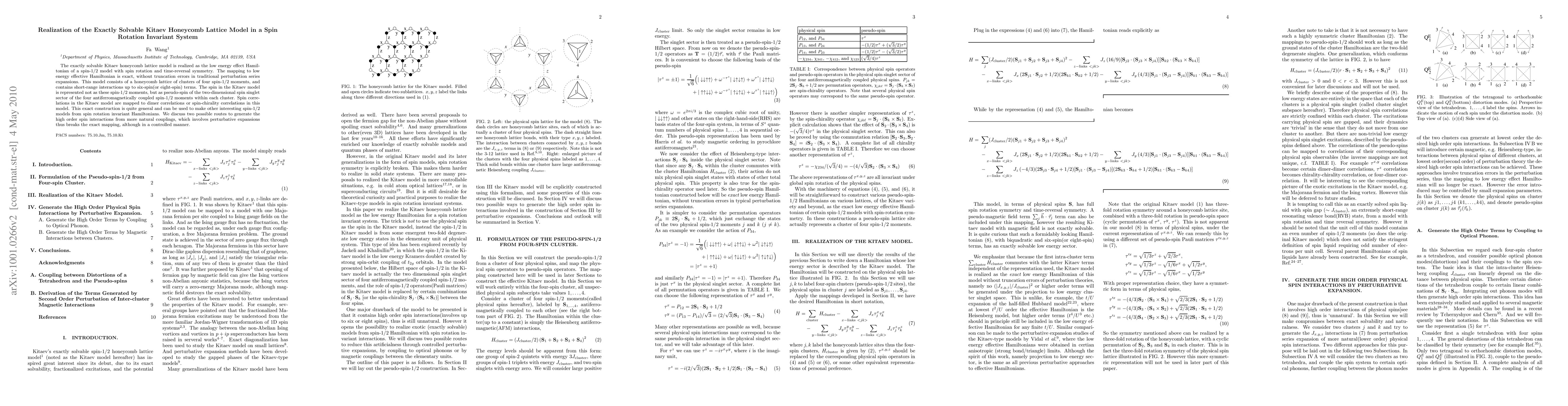 The paper presents an exact realization of the Kitaev honeycomb model as the low-energy Hamiltonian of a spin-1/2 system with spin rotation and time-reversal symmetry, mapping spin correlations to dimer or spin-chirality correlations, and discussing ways to introduce higher-order spin interactions.