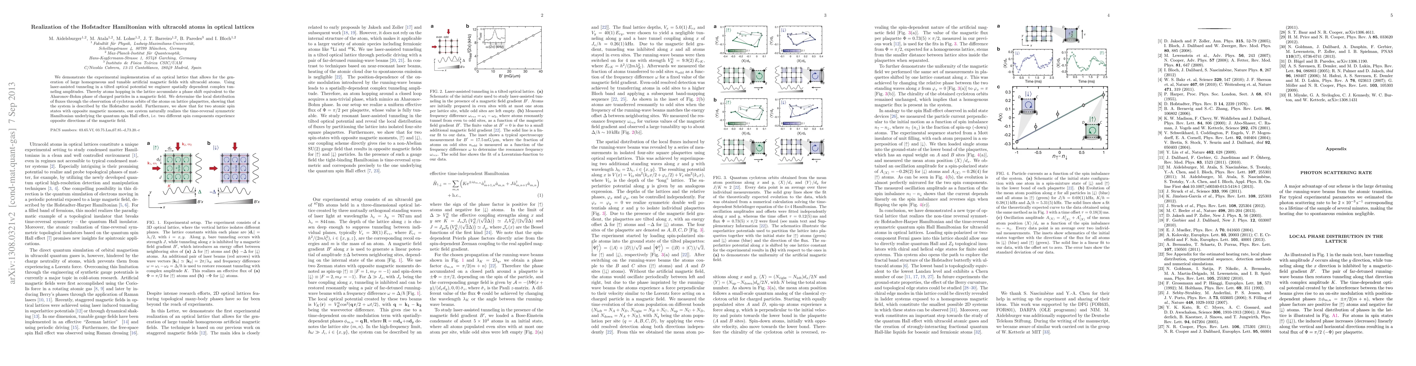 This paper demonstrates the experimental realization of the Hofstadter Hamiltonian using ultracold atoms in optical lattices, where large, tunable artificial magnetic fields are generated. The system exhibits cyclotron orbits, confirming the Hofstadter model, and naturally realizes the time-reversal symmetric Hamiltonian for the quantum spin Hall effect.