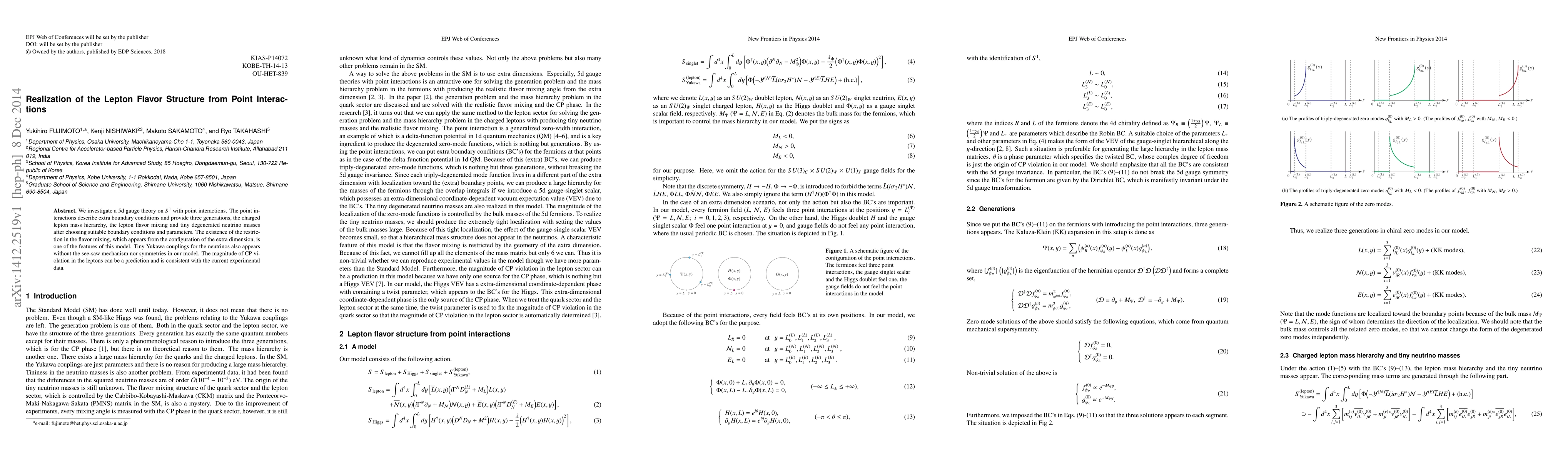 This paper explores a 5d gauge theory with point interactions on $S^1$ to realize lepton flavor structure, generating three generations and explaining the charged lepton mass hierarchy, lepton flavor mixing, and tiny neutrino masses through specific boundary conditions. The model predicts CP violation magnitudes consistent with experimental data.