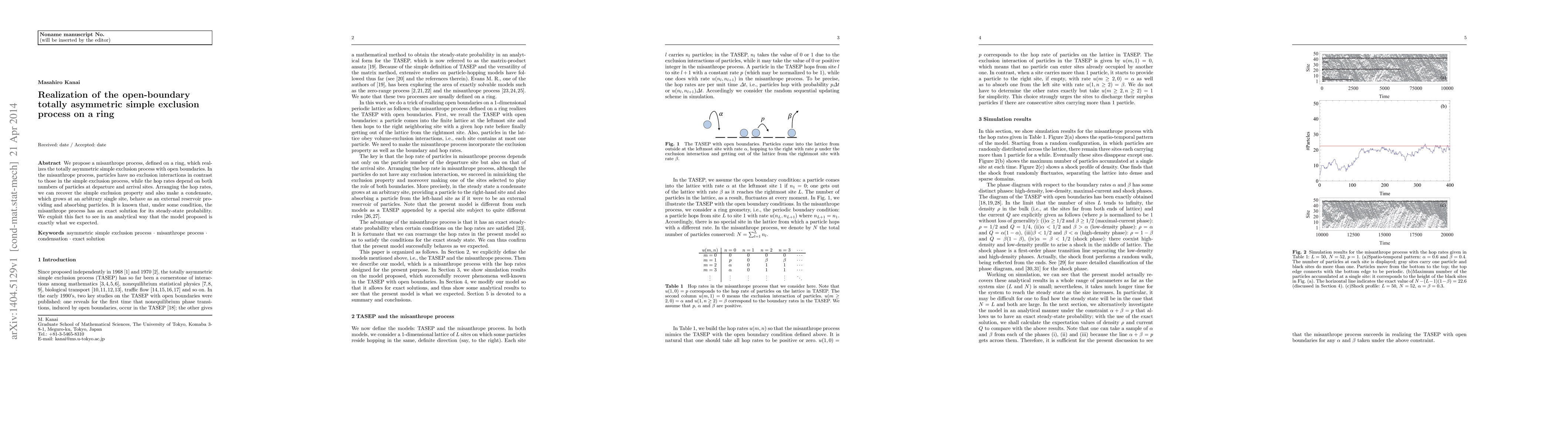 This paper proposes a misanthrope process on a ring that mimics the behavior of the totally asymmetric simple exclusion process with open boundaries, using hop rates that depend on particle counts at departure and arrival sites. The model is analytically shown to achieve the desired exclusion properties and can simulate a condensate acting as an external reservoir.
