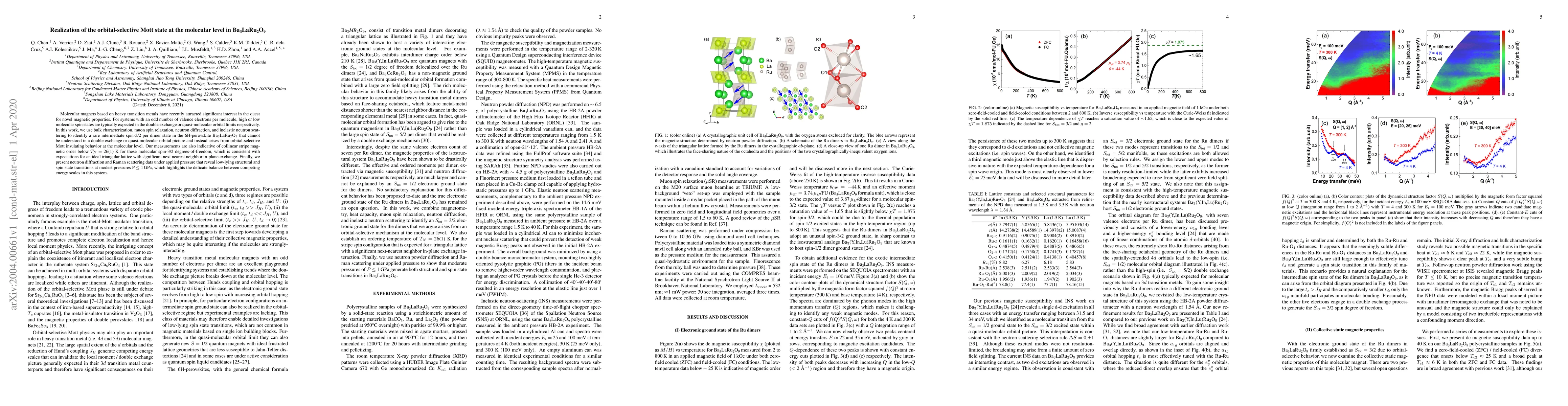 Molecular magnets based on heavy transition metals have recently attracted significant interest in the quest for novel magnetic properties. For systems with an odd number of valence electrons per molecule, high or low molecular spin states are typically expected in the double exchange or quasi-molecular orbital limits respectively. In this work, we use bulk characterization, muon spin relaxation, neutron diffraction, and inelastic neutron scattering to identify a rare intermediate spin-3/2 per dimer state in the 6H-perovskite Ba$_3$LaRu$_2$O$_9$ that cannot be understood in a double exchange or quasi-molecular orbital picture and instead arises from orbital-selective Mott insulating behavior at the molecular level. Our measurements are also indicative of collinear stripe magnetic order below $T_N$ = 26(1) K for these molecular spin-3/2 degrees-of-freedom, which is consistent with expectations for an ideal triangular lattice with significant next nearest neighbor in-plane exchange. Finally, we present neutron diffraction and Raman scattering data under applied pressure that reveal low-lying structural and spin state transitions at modest pressures P $\le$ 1 GPa, which highlights the delicate balance between competing energy scales in this system.
