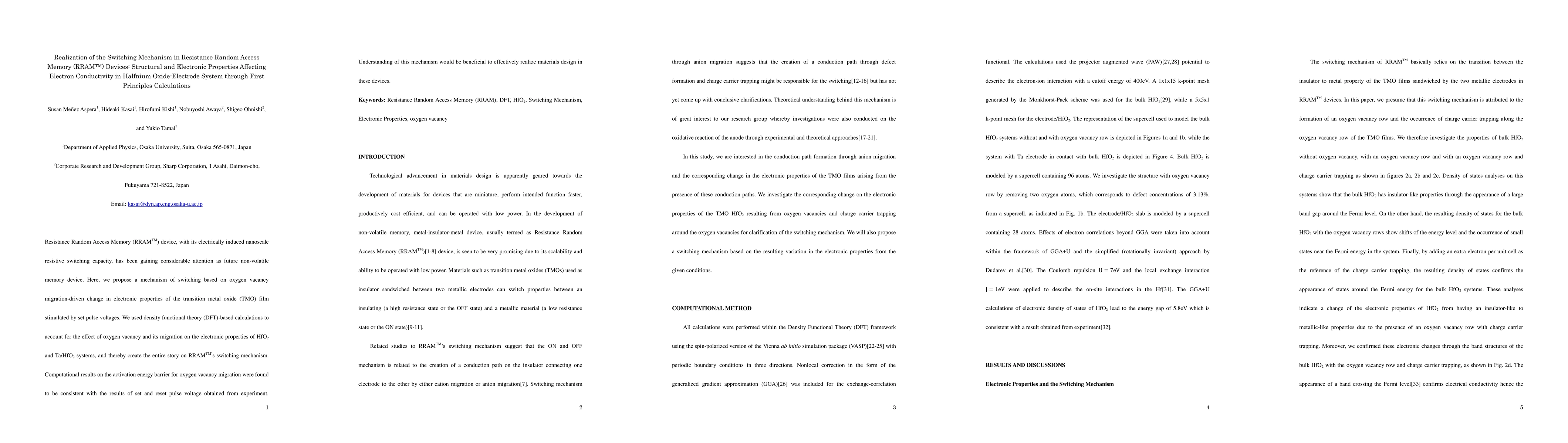 Resistance Random Access Memory (RRAMTM) device, with its electrically induced nanoscale resistive switching capacity, has been gaining considerable attention as future non-volatile memory device. Here, we propose a mechanism of switching based on oxygen vacancy migration-driven change in electronic properties of the transition metal oxide (TMO) film stimulated by set pulse voltages. We used density functional theory (DFT)-based calculations to account for the effect of oxygen vacancy and its migration on the electronic properties of HfO2 and Ta/HfO2 systems, and thereby create the entire story on RRAMTM's switching mechanism. Computational results on the activation energy barrier for oxygen vacancy migration were found to be consistent with the results of set and reset pulse voltage obtained from experiment. Understanding of this mechanism would be beneficial to effectively realize materials design in these devices.