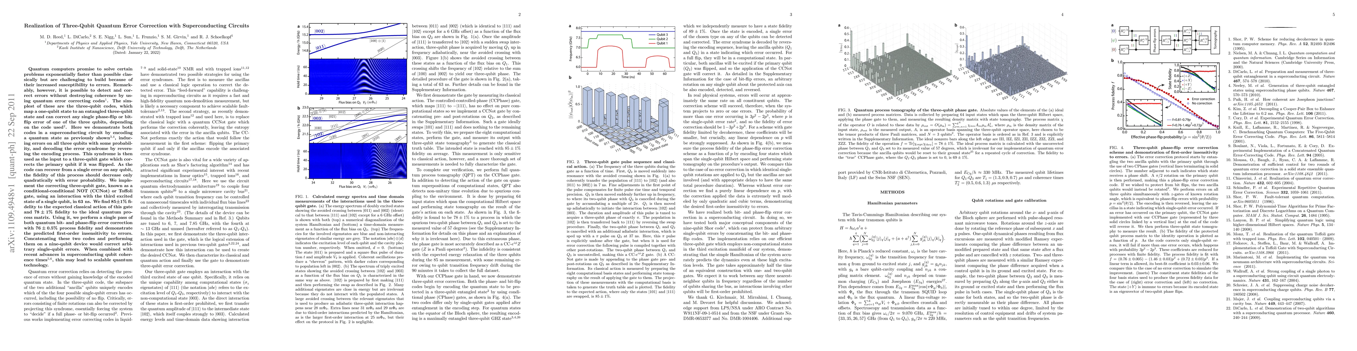 This paper demonstrates the realization of three-qubit quantum error correction in superconducting circuits, implementing both bit-flip and phase-flip error correction codes. The fidelity of the conditional-conditional NOT gate used for correction is found to be 85±1%, showing the predicted first-order insensitivity to errors.