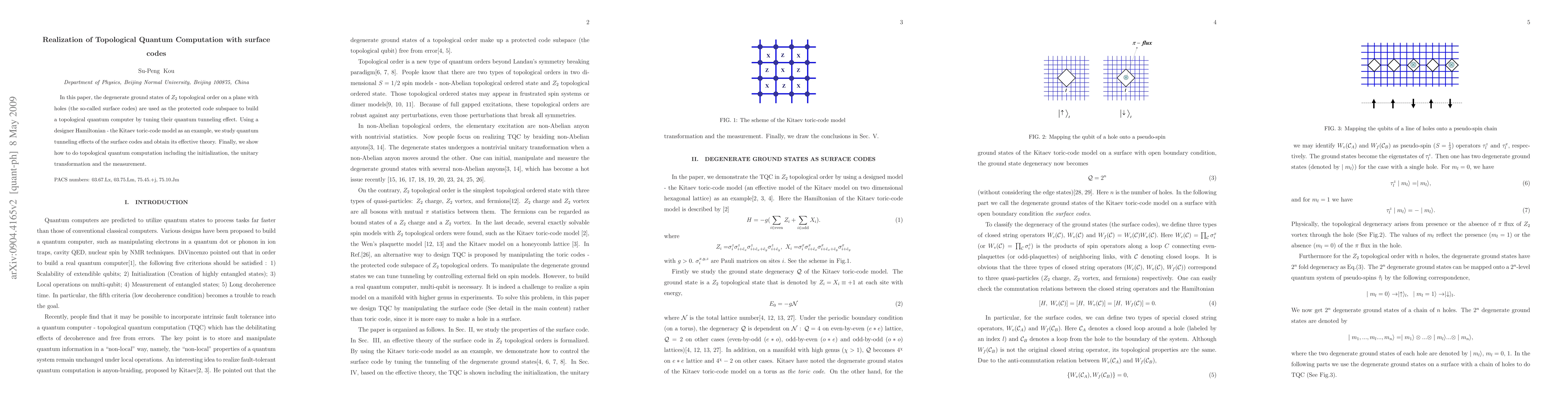 In this paper, the degenerate ground states of Z2 topological order on a plane with holes (the so-called surface codes) are used as the protected code subspace to build a topological quantum computer by tuning their quantum tunneling effect. Using a designer Hamiltonian - the Kitaev toric-code model as an example, we study quantum tunneling effects of the surface codes and obtain its effective theory. Finally, we show how to do topological quantum computation including the initialization, the unitary transformation and the measurement.