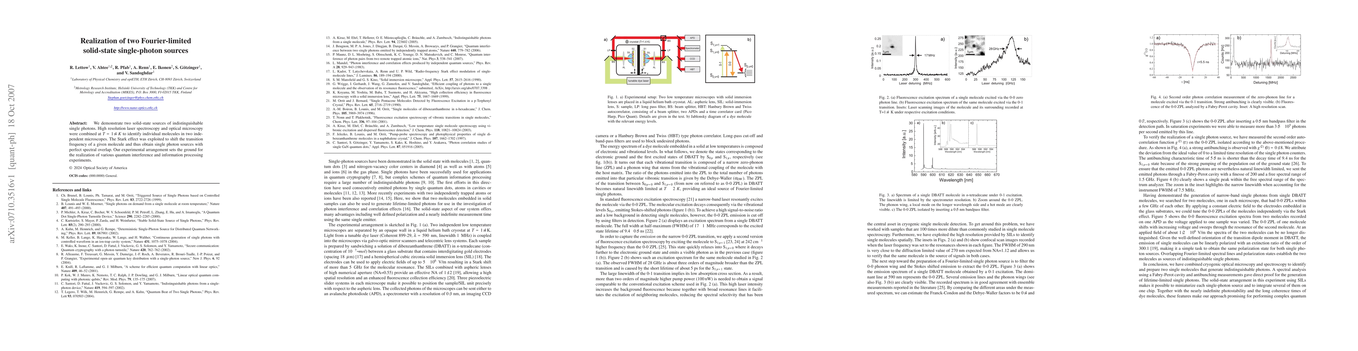This paper demonstrates the creation of two solid-state single-photon sources with indistinguishable spectral characteristics, achieved by identifying individual molecules at low temperature and using the Stark effect to align their transition frequencies. This setup is foundational for quantum interference and information processing experiments.