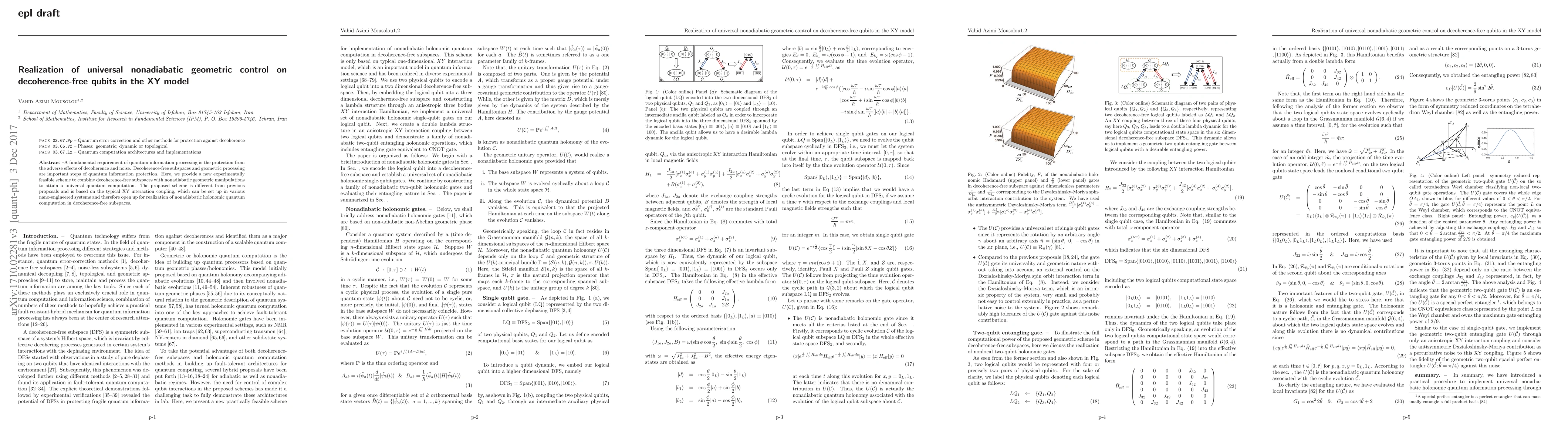 A fundamental requirement of quantum information processing is the protection from the adverse effects of decoherence and noise. Decoherence-free subspaces and geometric processing are important steps of quantum information protection. Here, we provide a new experimentally feasible scheme to combine decoherence-free subspaces with nonadiabatic geometric manipulations to attain a universal quantum computation. The proposed scheme is different from previous proposals and is based on the typical XY interaction coupling, which can be set up in various nano-engineered systems and therefore open up for realization of nonadiabatic holonomic quantum computation in decoherence-free subspaces.