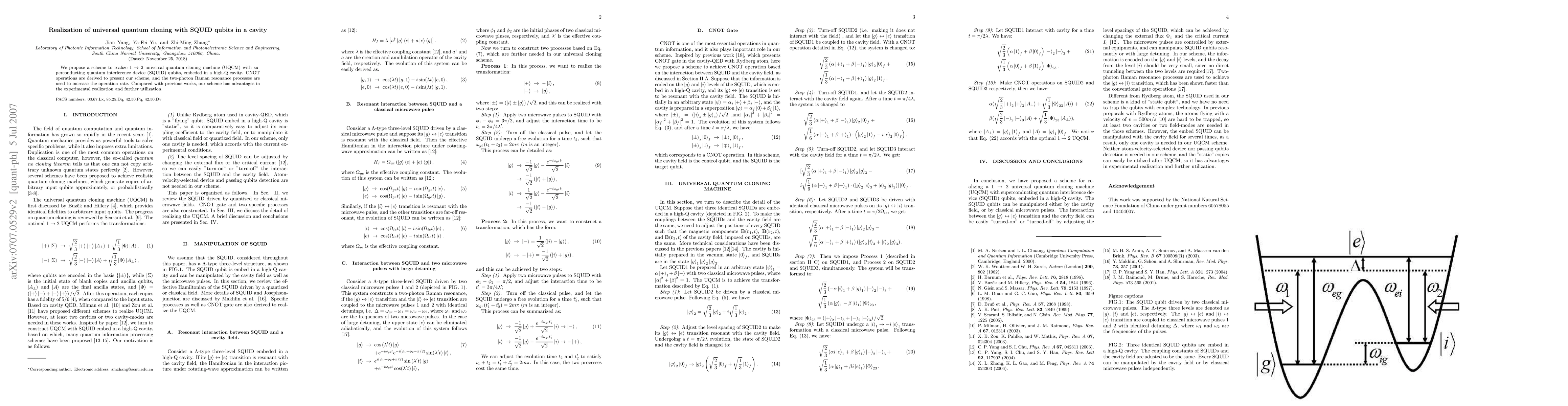 This paper proposes a scheme for a $1\to 2$ universal quantum cloning machine using SQUID qubits in a high-Q cavity, employing CNOT operations and two-photon Raman resonance to enhance operational efficiency, offering advantages over previous methods in experimental feasibility and application.