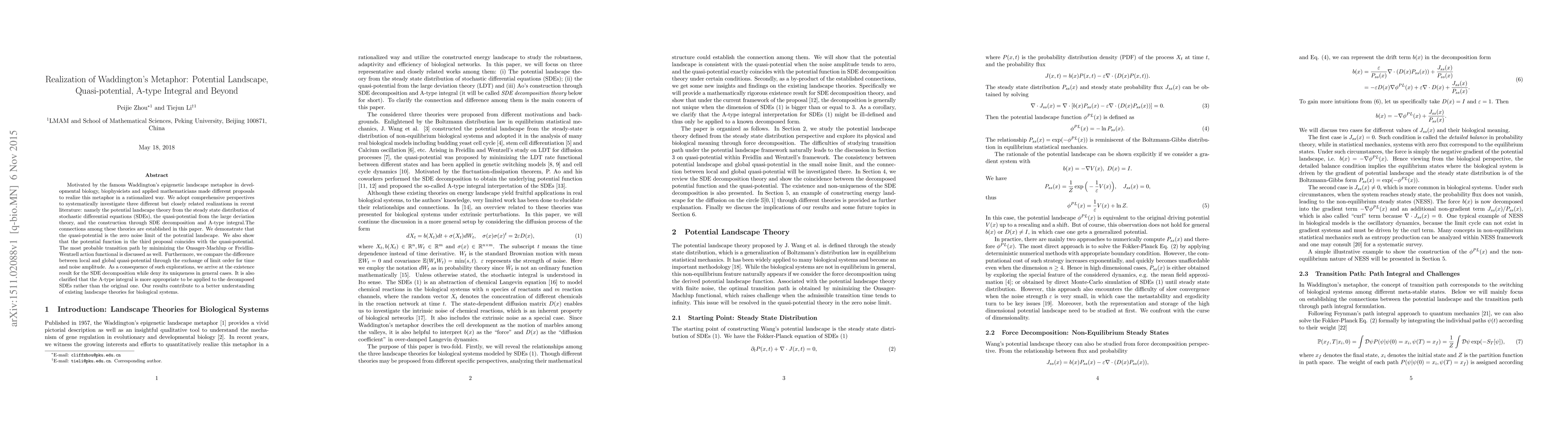The paper explores how three different mathematical theories - potential landscape, quasi-potential, and A-type integral - relate to each other, showing that the quasi-potential is a limit of the potential landscape in zero noise, and providing insights into biological systems' development and behavior.