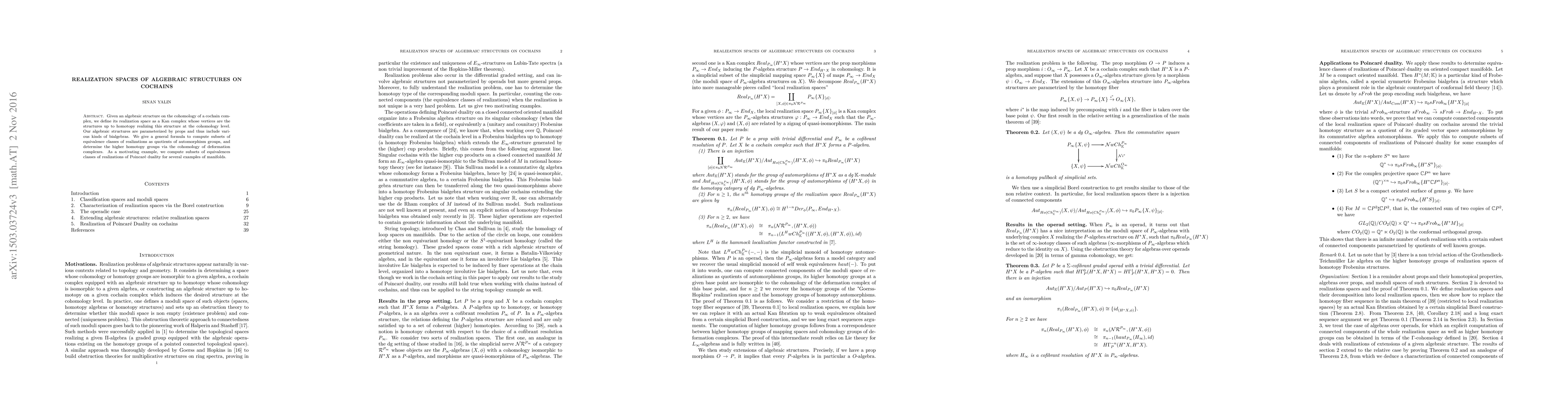 This paper defines realization spaces for algebraic structures on homology as Kan complexes, parametrizing these structures by props, and provides a method to compute equivalence classes of realizations via automorphism groups and deformation complex cohomology. It applies this framework to compute realizations of Poincaré duality for various manifolds.