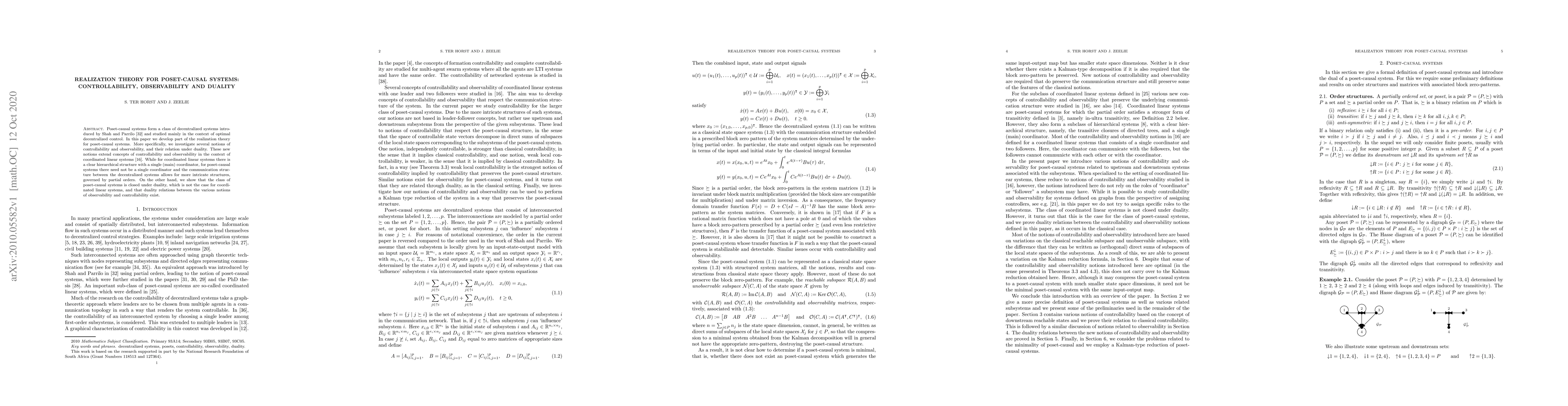 Poset-causal systems form a class of decentralized systems introduced by Shah and Parrilo [32] and studied mainly in the context of optimal decentralized control. In this paper we develop part of the realization theory for poset-causal systems. More specifically, we investigate several notions of controllability and observability, and their relation under duality. These new notions extend concepts of controllability and observability in the context of coordinated linear systems [16]. While for coordinated linear systems there is a clear hierarchical structure with a single (main) coordinator, for poset-causal systems there need not be a single coordinator and the communication structure between the decentralized systems allows for more intricate structures, governed by partial orders. On the other hand, we show that the class of poset-causal systems is closed under duality, which is not the case for coordinated linear systems, and that duality relations between the various notions of observability and controllability exist.
