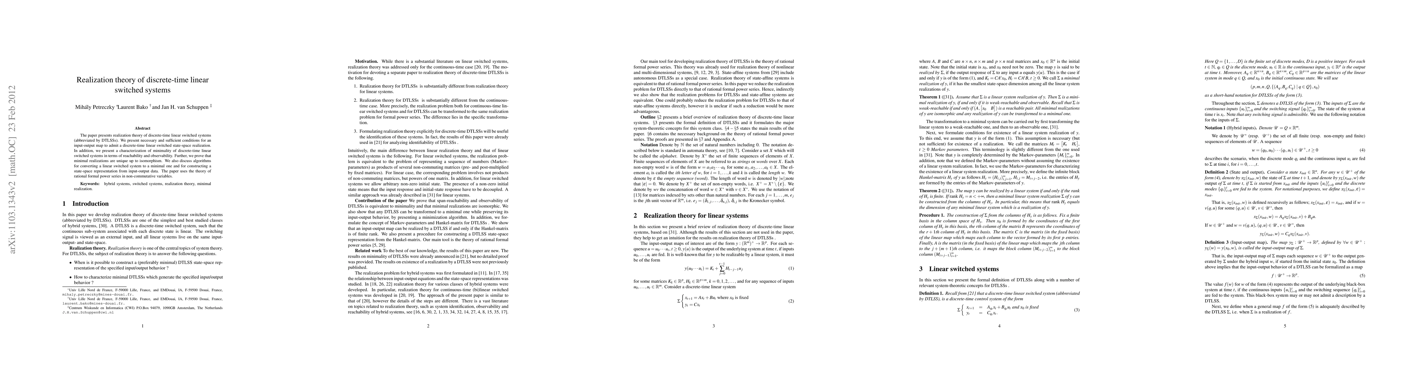 The paper presents realization theory of discrete-time linear switched systems. A discrete-time linear switched system is a hybrid system, such that the continuous sub-system associated with each discrete state is linear. In this paper we present necessary and sufficient conditions for an input-output map to admit a discrete-time linear switched state-space realization. The conditions are formulated as finite rank conditions of a generalized Hankel-matrix. In addition, we present a characterization of minimality of discrete-time linear switched systems in terms of reachability and observable.Further, we prove that minimal realizations are unique up to isomorphism. We also discuss procedures for converting a linear switched system to a minimal one and we present an algorithm for constructing a state-space representation from input-output data.The paper uses the theory rational formal power series in non-commutative variables. The latter theory was successfully applied to bilinear and state-affine systems in the past.