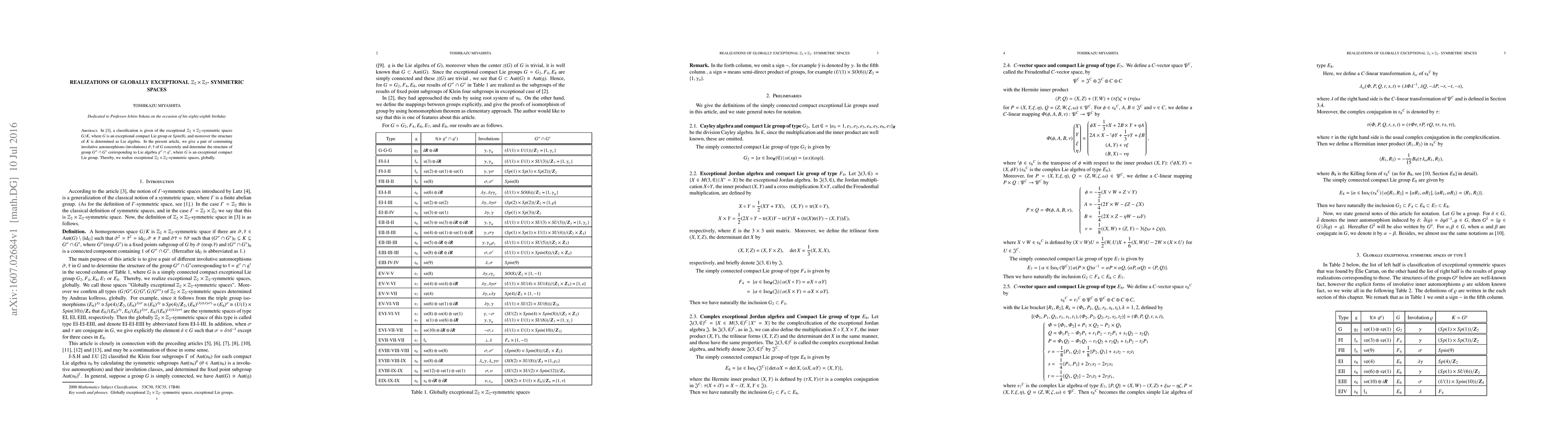 This paper classifies exceptional $\mathbb{Z}_2 \times \mathbb{Z}_2$-symmetric spaces $G/K$ for exceptional compact Lie groups, specifically $Spin(8)$. It provides explicit commuting involutions $\tilde{\sigma}, \tilde{\tau}$ and determines the structure of the subgroup $G^{\sigma} \cap G^{\tau}$, realizing these symmetric spaces globally.