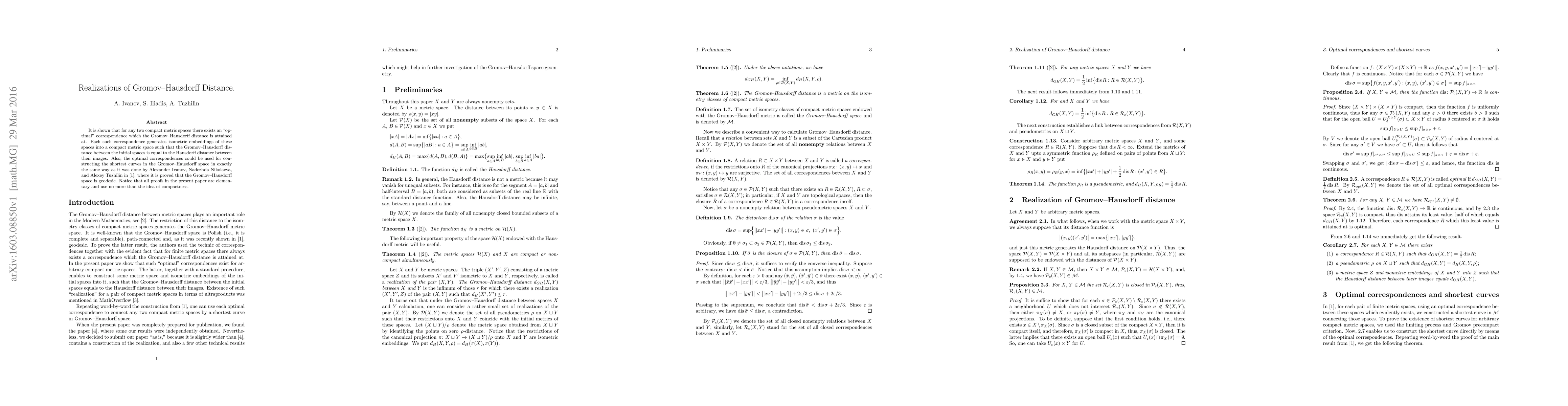 This paper demonstrates the existence of optimal correspondences for compact metric spaces that realize the Gromov-Hausdorff distance. It proves that these correspondences generate isometric embeddings into a compact metric space, equating the Gromov-Hausdorff distance to the Hausdorff distance of their images, and employs them to construct the shortest paths in the Gromov-Hausdorff space.
