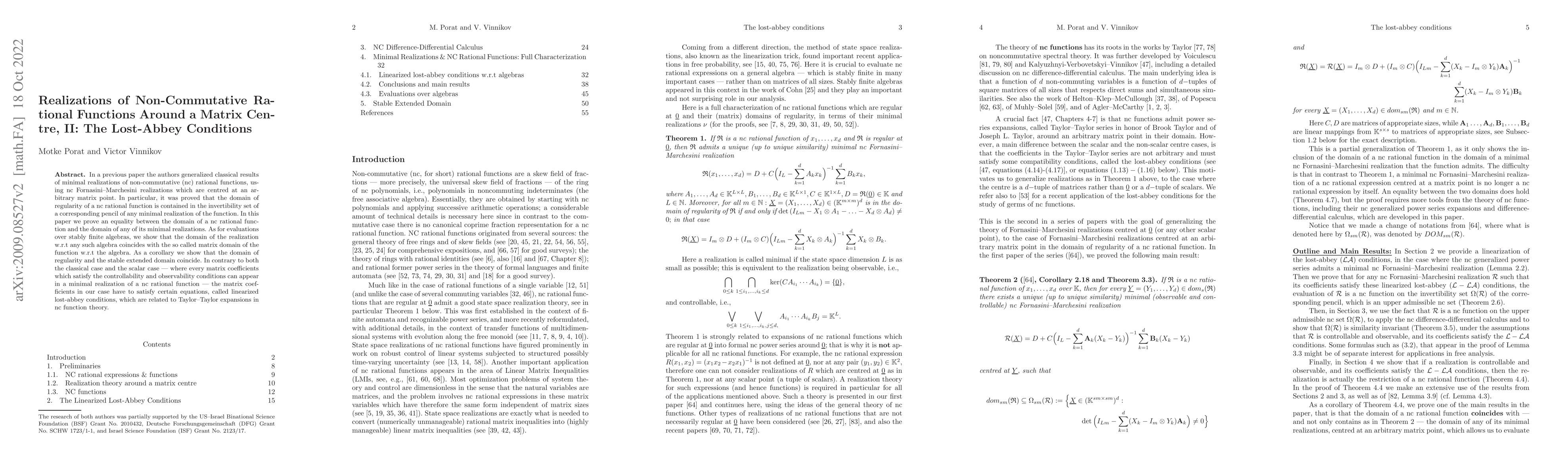This paper extends previous work on minimal realizations of non-commutative rational functions centered around a matrix point, proving an equality between the domain of a function and its minimal realizations. It introduces the linearized lost-abbey conditions, which matrix coefficients must satisfy, contrasting with the classical and scalar cases.
