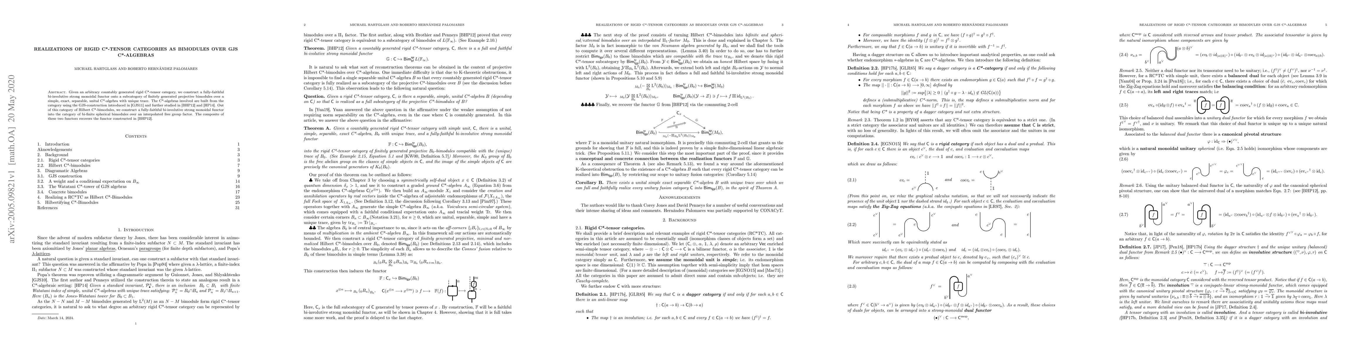 Given an arbitrary countably generated rigid C*-tensor category, we construct a fully-faithful bi-involutive strong monoidal functor onto a subcategory of finitely generated projective bimodules over a simple, exact, separable, unital C*-algebra with unique trace. The C*-algebras involved are built from the category using the GJS-construction introduced in arXiv:0911.4728 and further studied in arXiv:1208.5505 and arXiv:1401.2486. Out of this category of Hilbert C*-bimodules, we construct a fully-faithful bi-involutive strong monoidal functor into the category of bi-finite spherical bimodules over an interpolated free group factor. The composite of these two functors recovers the functor constructed in arXiv:1208.5505