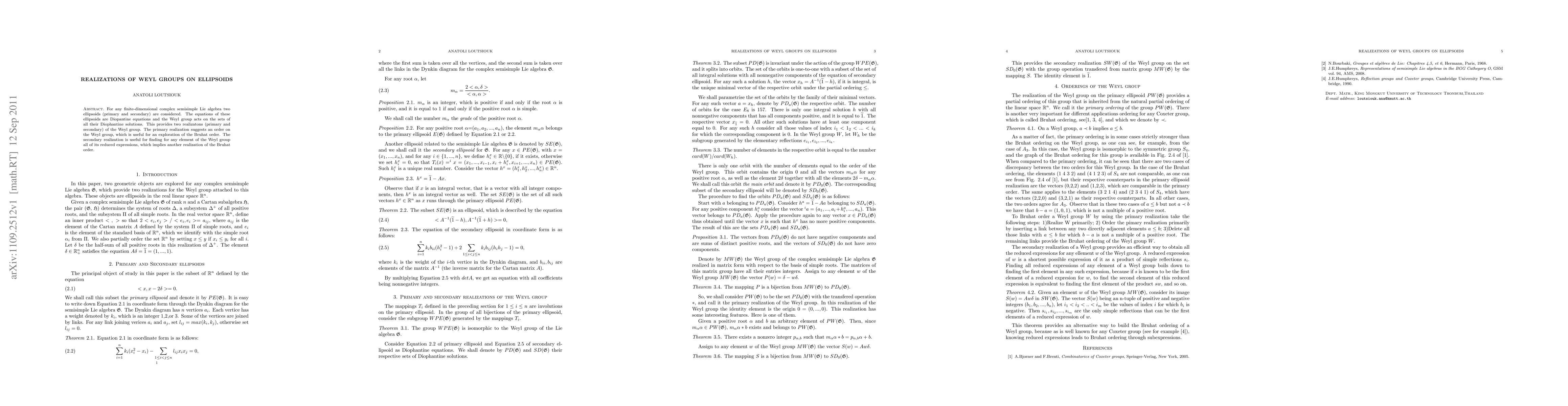 For any finite-dimensional complex semisimple Lie algebra two ellipsoids (primary and secondary) are considered. The equations of these ellipsoids are Diophantine equations and the Weyl group acts on the sets of all their Diophantine solutions. This provides two realizations (primary and secondary) of the Weyl group. The primary realization suggests an order on the Weyl group, which is useful for an exploration of the Bruhat order. The secondary realization is useful for finding for any element of the Weyl group all of its reduced expressions, which implies another realization of the Bruhat order.