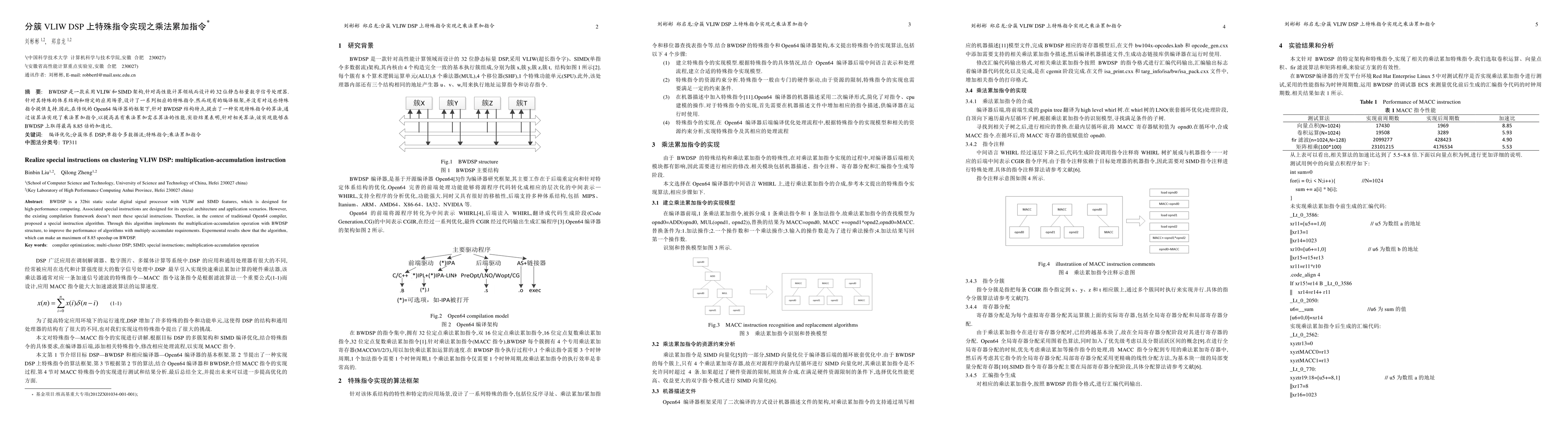 This paper proposes a special instruction algorithm within the Open64 compiler framework to optimize multiplication-accumulation operations for the BWDSP VLIW DSP processor, achieving up to 8.85 times speedup in performance. The algorithm addresses the limitations of existing compilation frameworks for BWDSP's unique architecture.