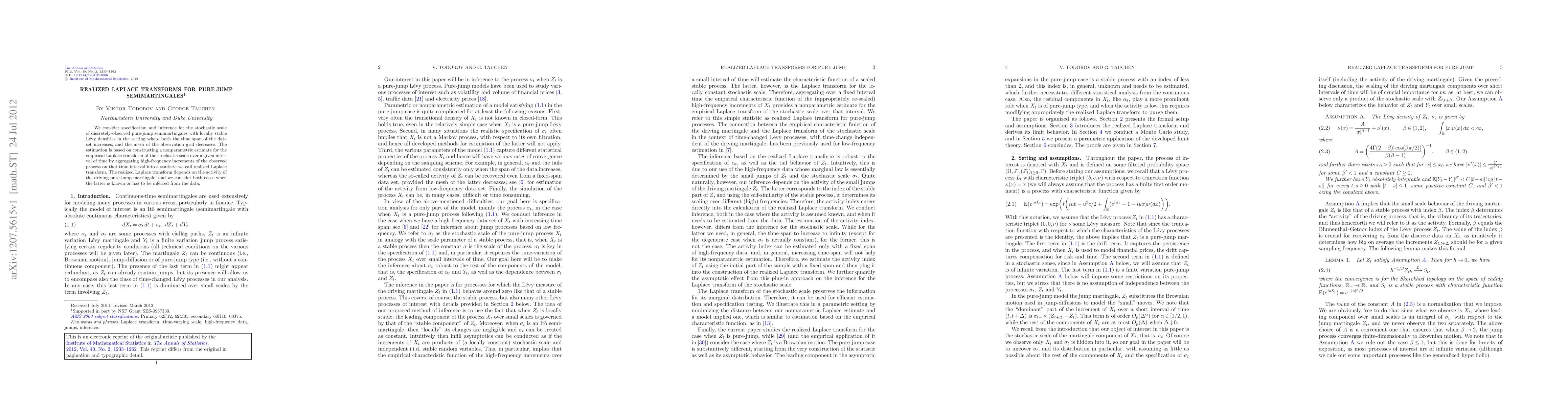 We consider specification and inference for the stochastic scale of discretely-observed pure-jump semimartingales with locally stable L\'{e}vy densities in the setting where both the time span of the data set increases, and the mesh of the observation grid decreases. The estimation is based on constructing a nonparametric estimate for the empirical Laplace transform of the stochastic scale over a given interval of time by aggregating high-frequency increments of the observed process on that time interval into a statistic we call realized Laplace transform. The realized Laplace transform depends on the activity of the driving pure-jump martingale, and we consider both cases when the latter is known or has to be inferred from the data.