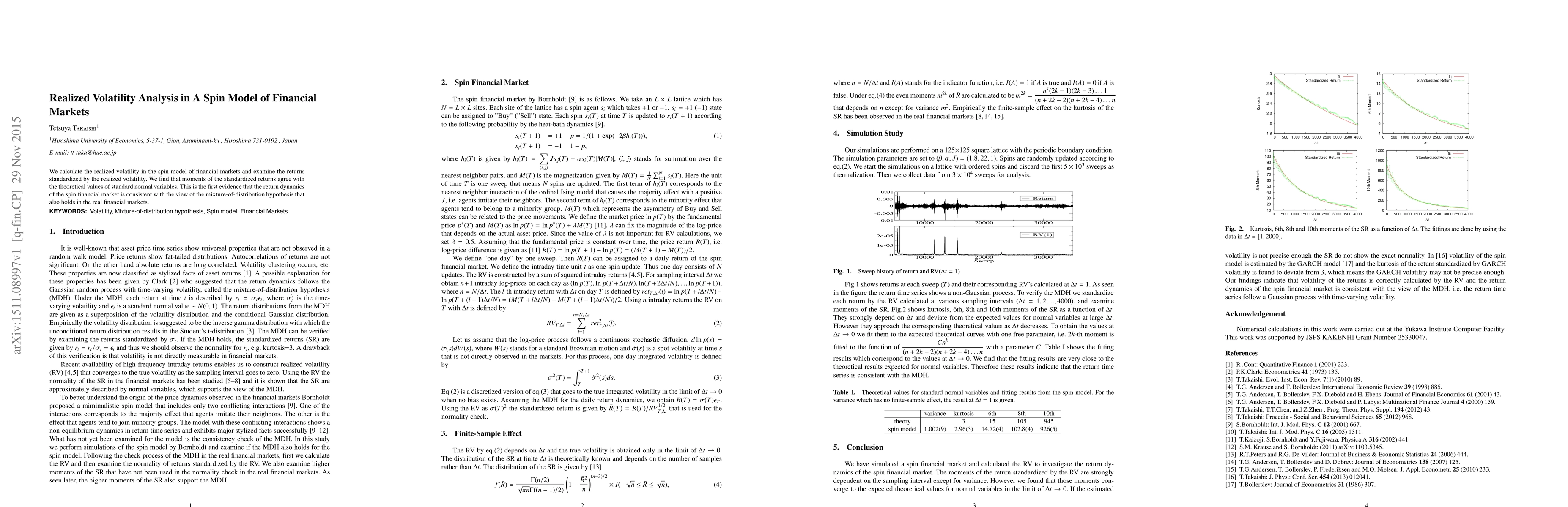 This paper investigates the realized volatility within a spin model of financial markets, finding that standardized returns match theoretical values of standard normal variables. This provides the first evidence supporting the mixture-of-distribution hypothesis in spin financial markets, aligning with real financial market dynamics.