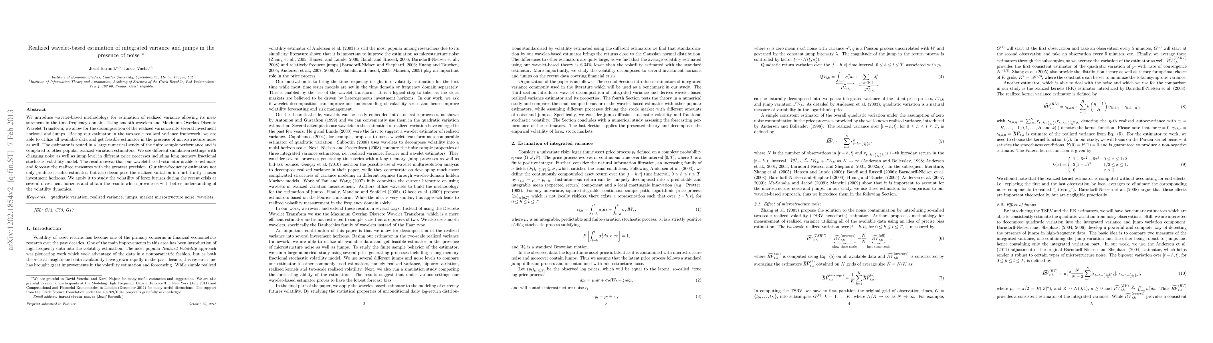 This paper proposes a wavelet-based method for estimating realized variance and jumps, decomposing them into different investment horizons and handling noise. The new estimator outperforms other methods in numerical studies and provides better insights into volatility dynamics during the forex crisis.