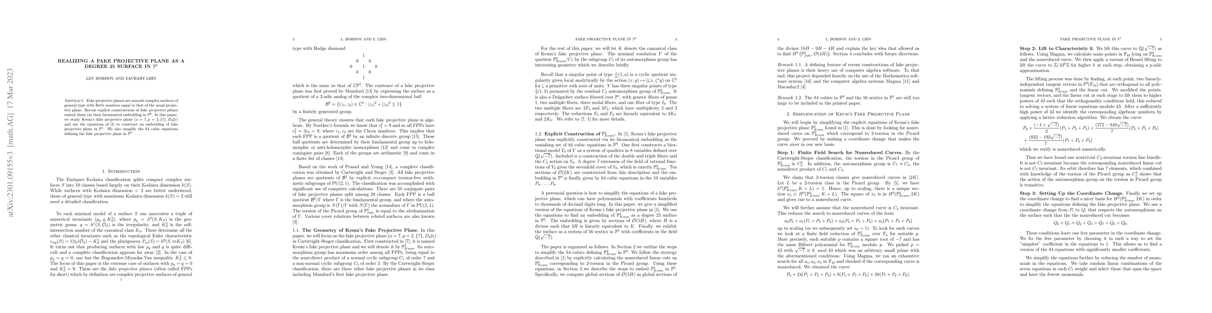 This paper constructs an embedding of Keum's fake projective plane $(a=7, p=2, \{7\}, D_3 2_7)$ into $\mathbb P^5$ using equations from Borisov, contrasting with its usual bicanonical embedding in $\mathbb P^9$, and simplifies the 84 cubic equations that define it.