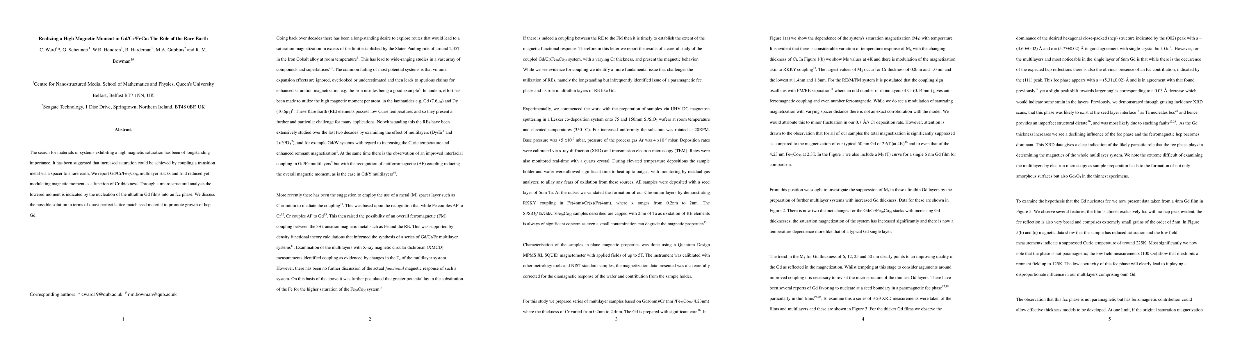 The search for materials or systems exhibiting a high magnetic saturation has been of longstanding importance. It has been suggested that increased saturation could be achieved by coupling a transition metal via a spacer to a rare earth. We report Gd/Cr/Fe70Co30 multilayer stacks and find reduced yet modulating magnetic moment as a function of Cr thickness. Through a micro structural analysis the lowered moment is indicated by the nucleation of the ultrathin Gd films into an fcc phase. We discuss the possible solution in terms of quasi-perfect lattice match seed material to promote growth of hcp Gd.