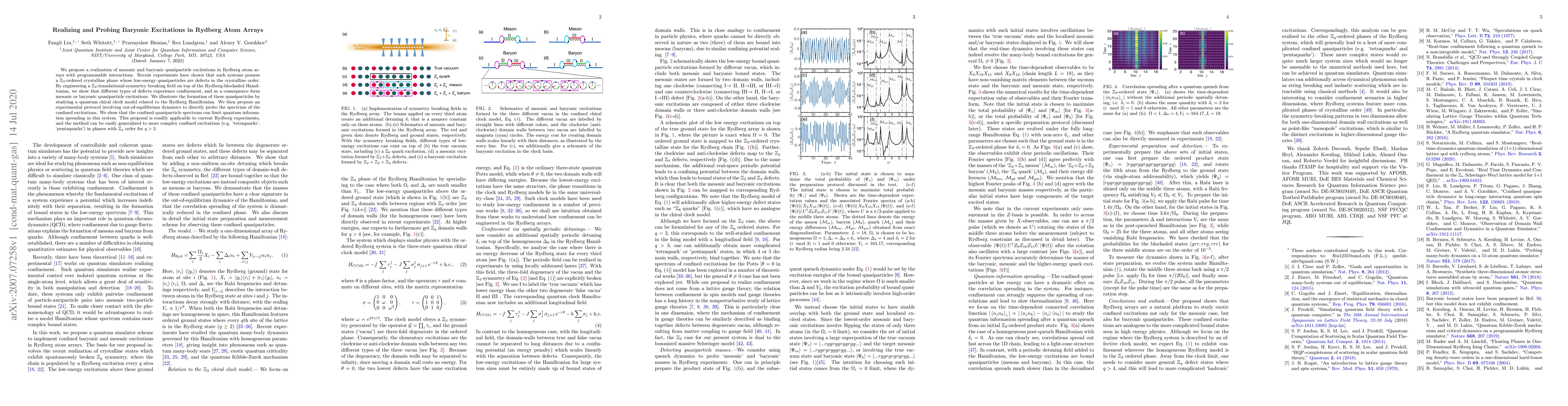 This paper proposes a method to realize and study baryonic and mesonic quasiparticle excitations in Rydberg atom arrays by introducing symmetry-breaking fields. It suggests an experimental protocol to probe these confined excitations, demonstrating their potential to limit quantum information spreading.